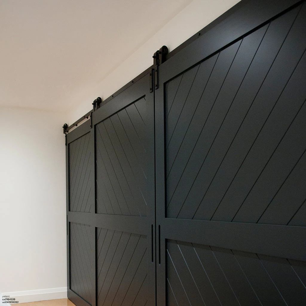 The Single Track Bypass™ barn door hardware, designed by Canadian studio 1925Workbench, allows two doors to slide on one single track, thus eliminating the need for excessive hardware involved in a traditional double track bypass system.