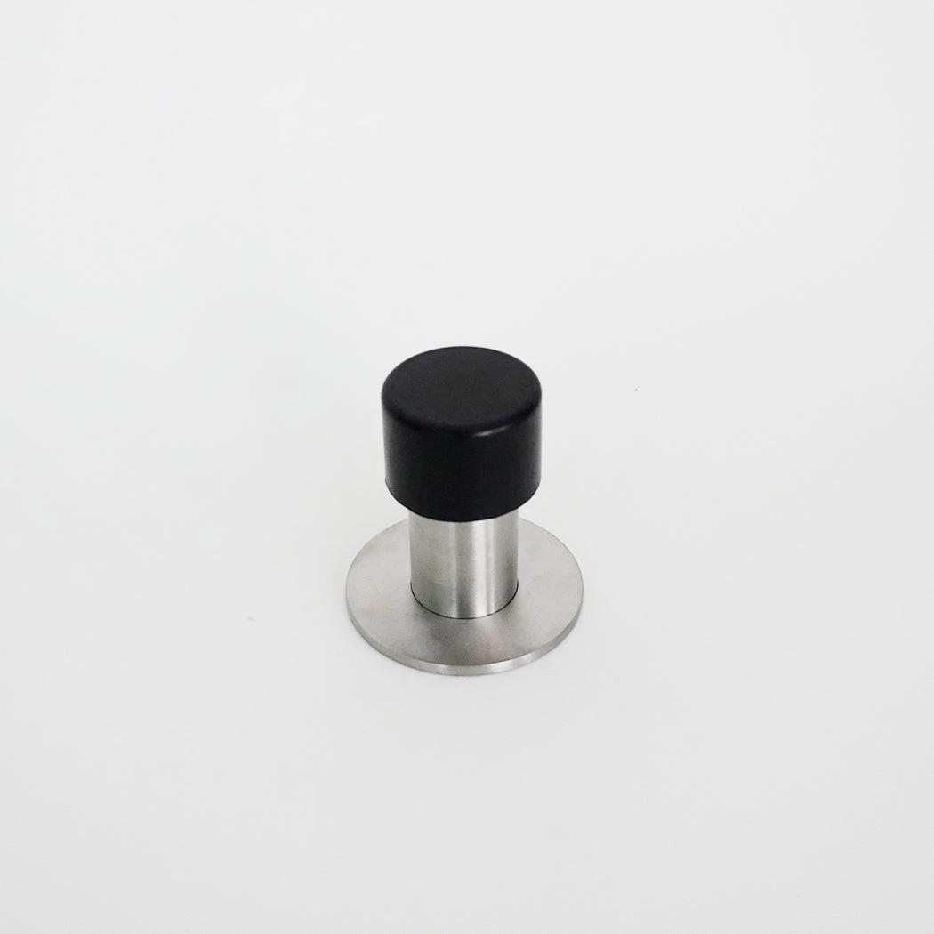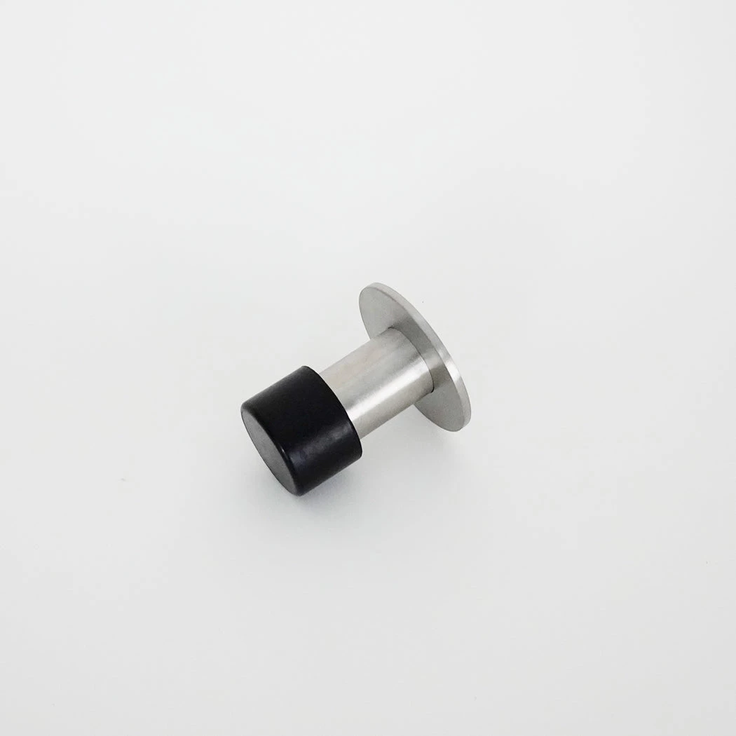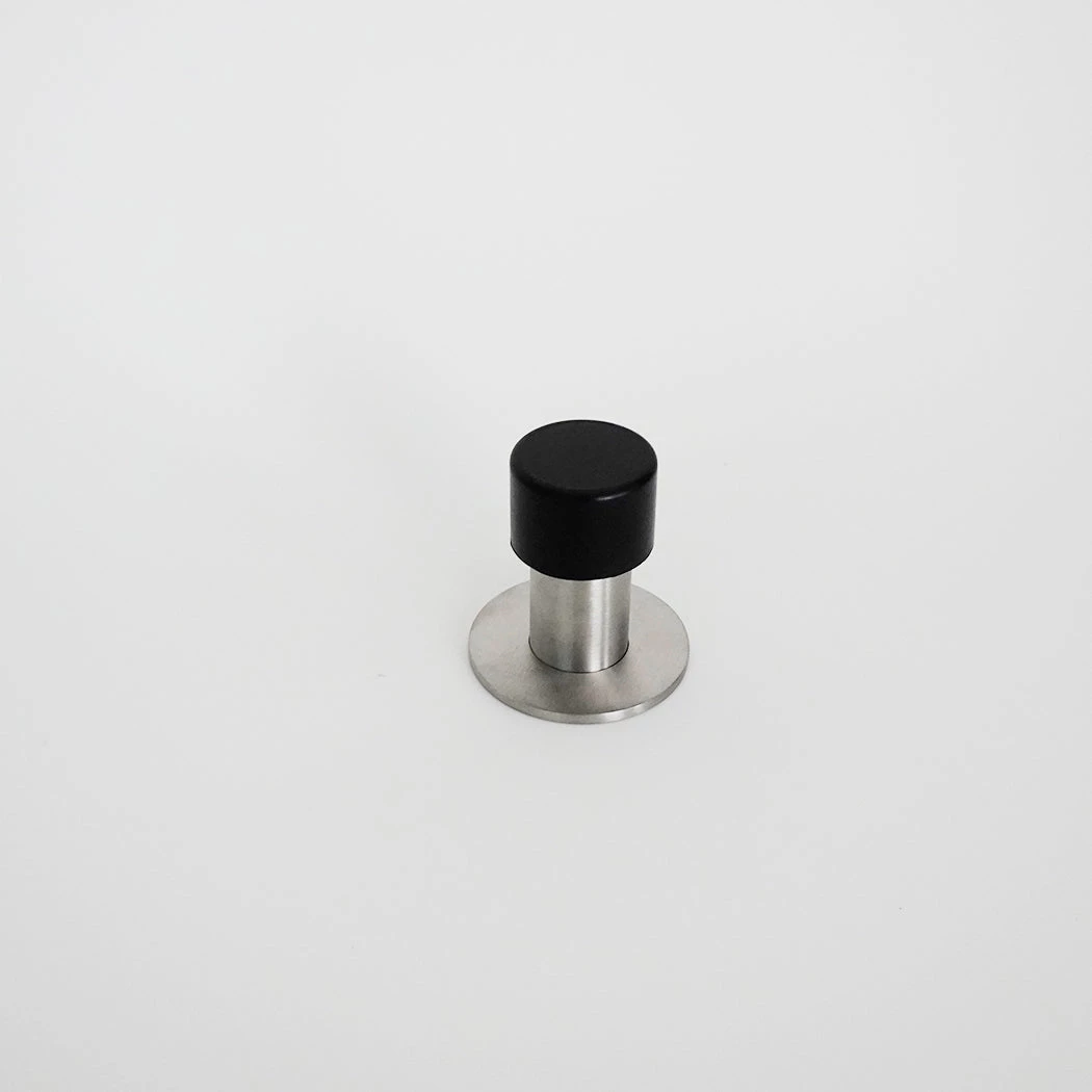 A floor or wall mounted door stop in satin stainless steel with slender profile and rubber stop.