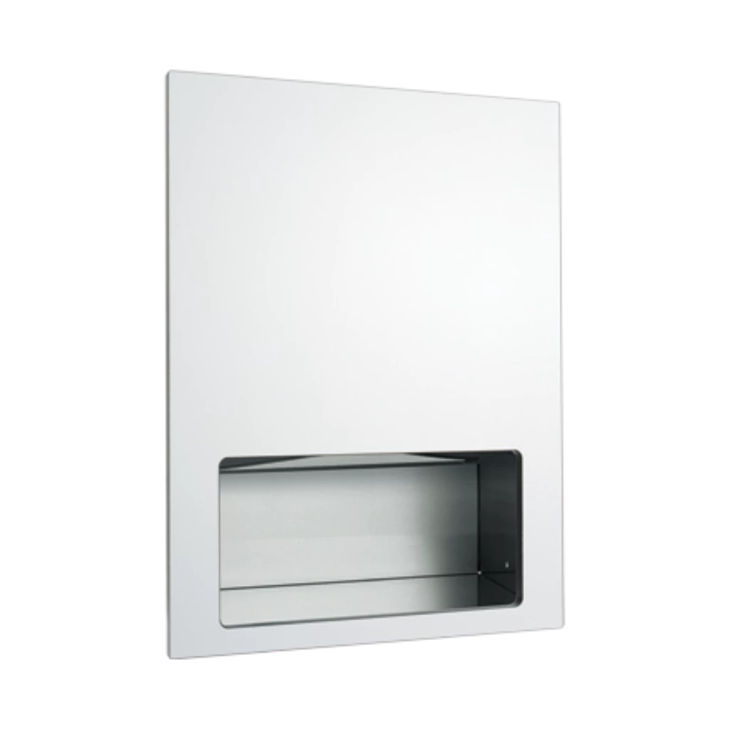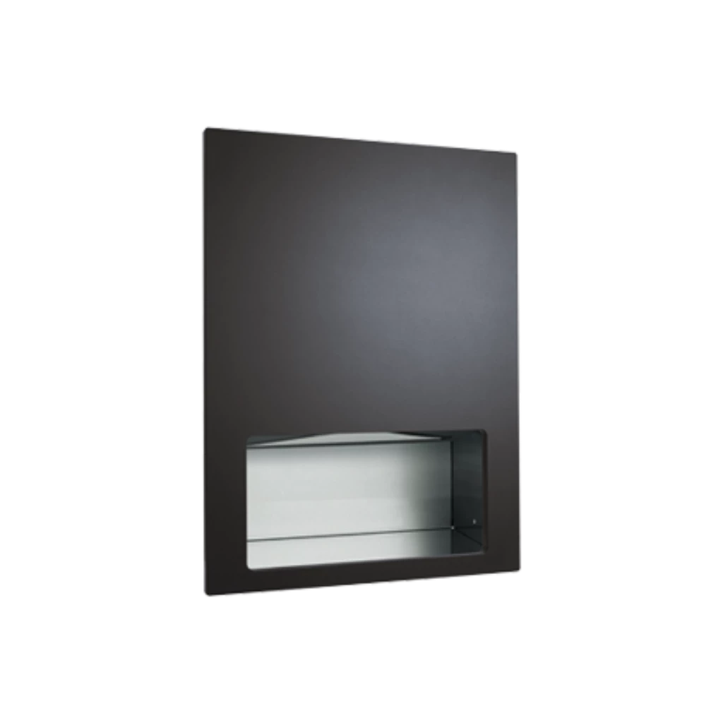 This sophisticated paper towel dispenser cabinet is designed to be completely recessed into the surface of the washroom wall, highlighting the seamless design that defines Piatto. The phenolic door is attached to the cabinet using field-adjustable, furniture quality hinges and is secured shut by an internal spring-loaded latch. All hardware is concealed giving the Piatto Collection its minimalist appeal.