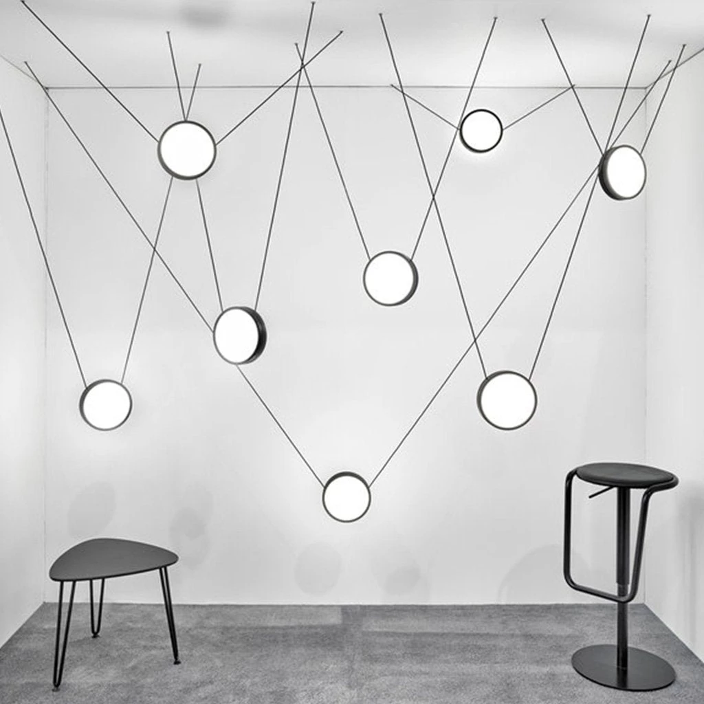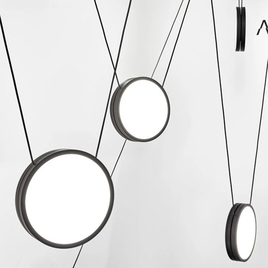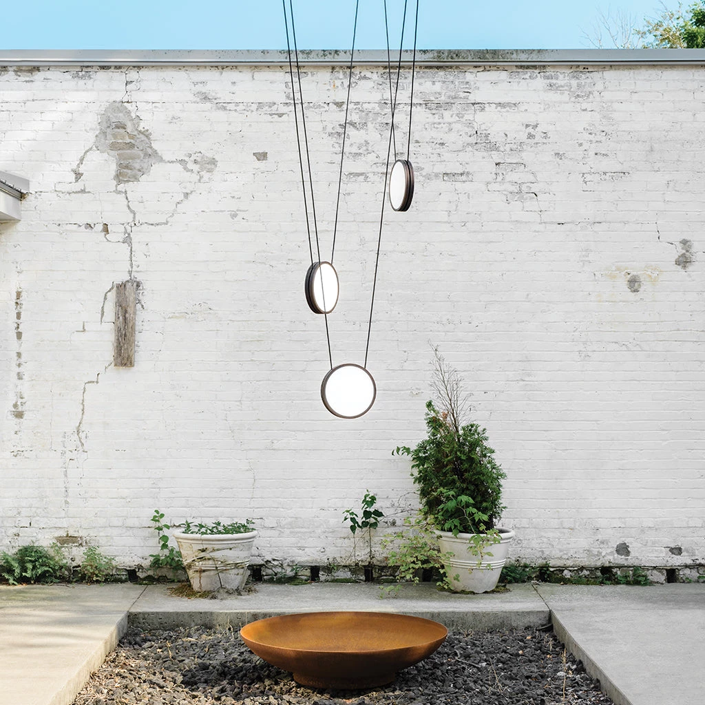 Highwire is a gravitational balancing act created by tension between two points and a weighted centre. These elegant, individually-weighted disks balance on custom made taut electrical cables that are produced with a matte finish. This allows the cables to lightly trace shapes in three-dimensional space, creating a flexibility to frame any room setting or furniture arrangement. These modular shapes are further accentuated by a diffused light which emanates from both sides of each disk—illuminating the surrounding area as well as the fixture.