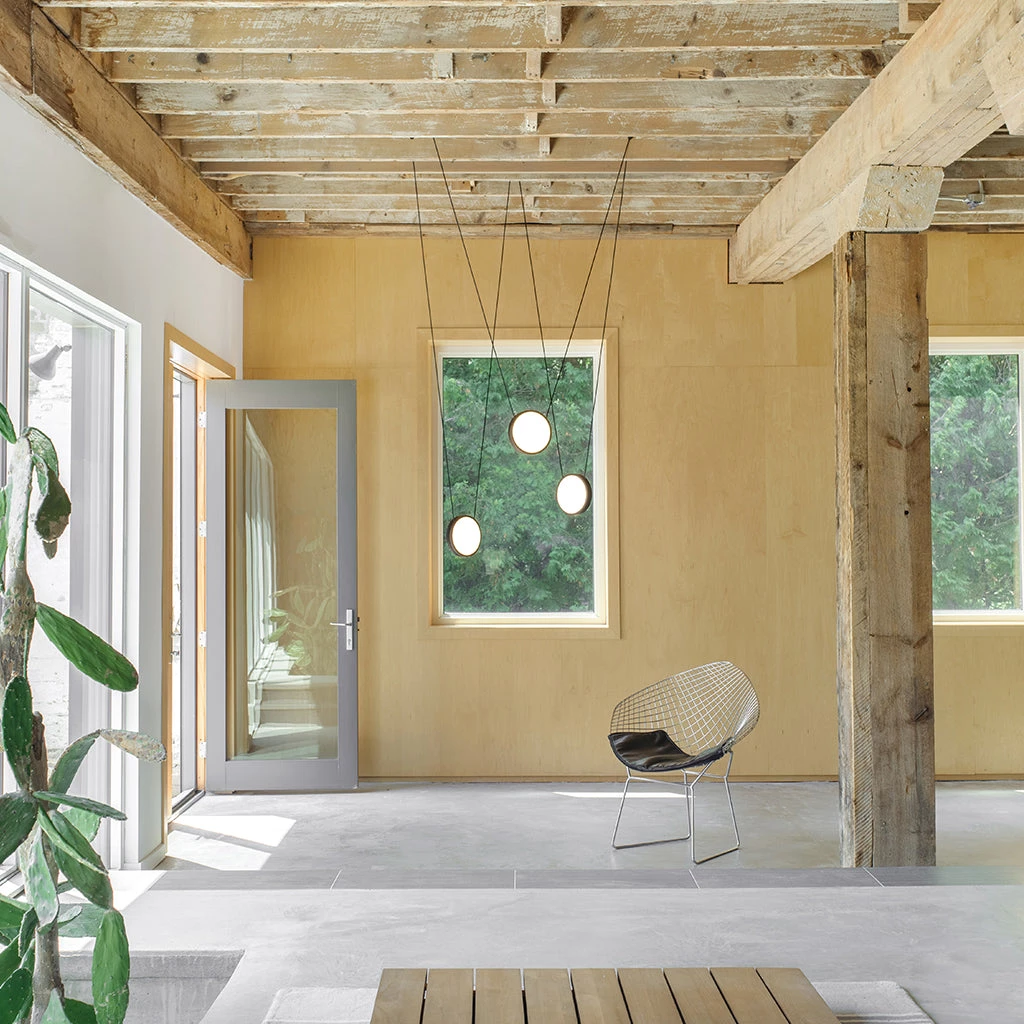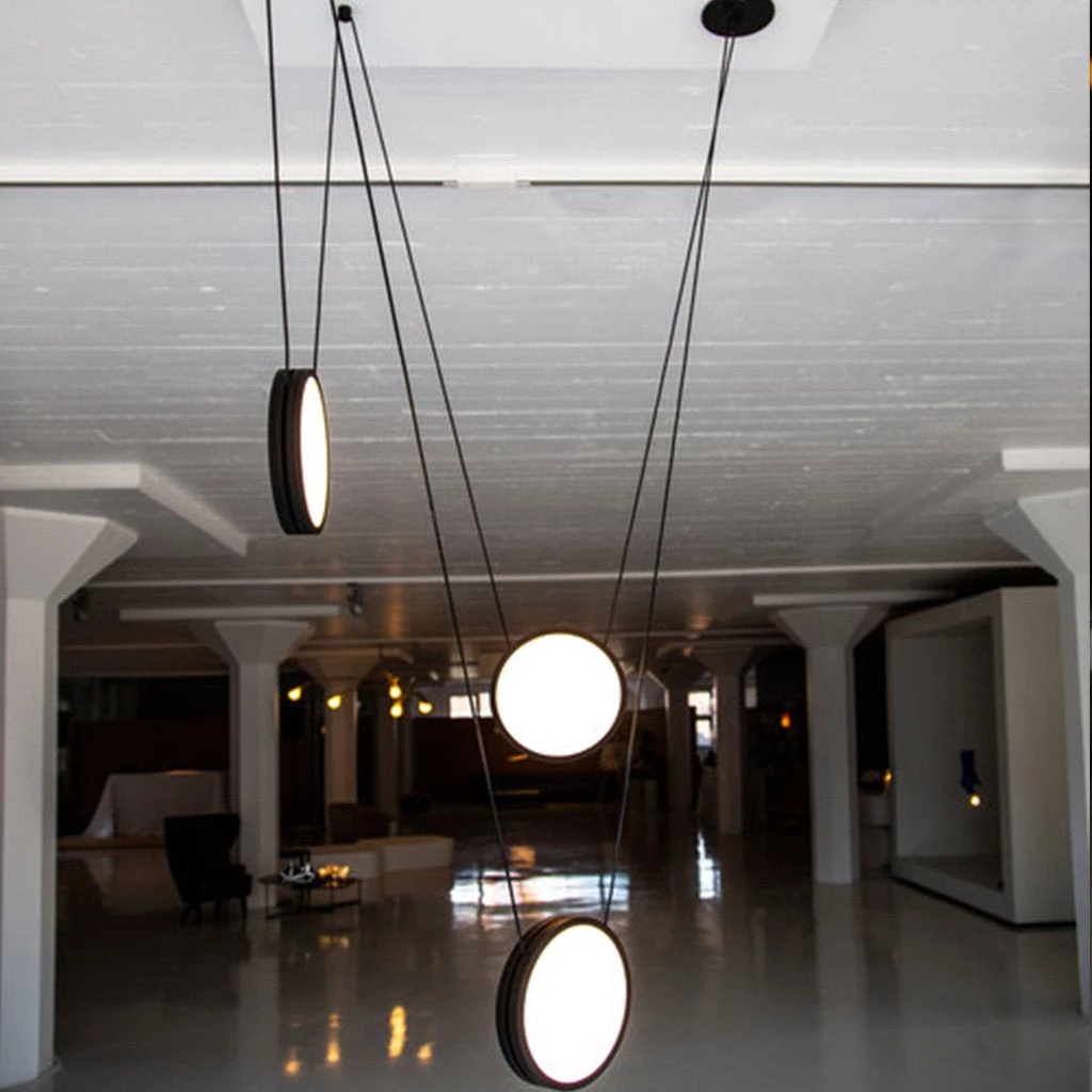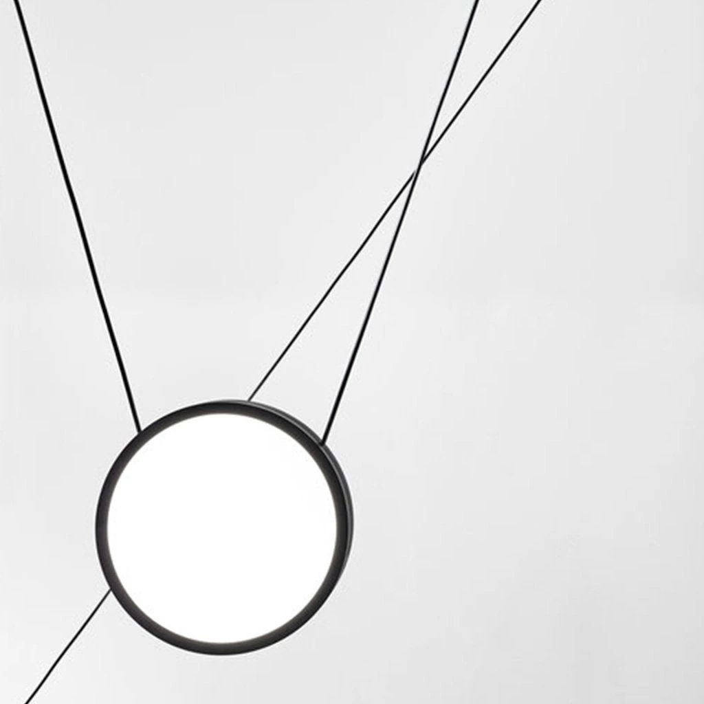 Highwire is a gravitational balancing act created by tension between two points and a weighted centre. These elegant, individually-weighted disks balance on custom made taut electrical cables that are produced with a matte finish. This allows the cables to lightly trace shapes in three-dimensional space, creating a flexibility to frame any room setting or furniture arrangement. These modular shapes are further accentuated by a diffused light which emanates from both sides of each disk—illuminating the surrounding area as well as the fixture.