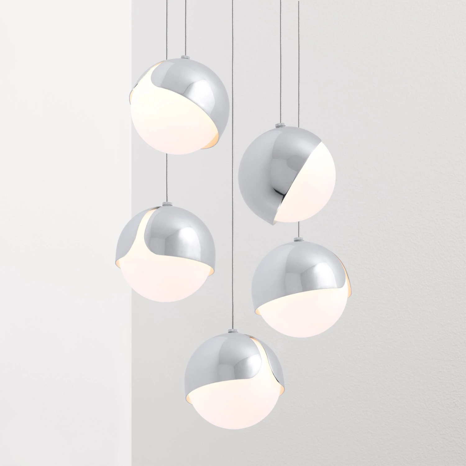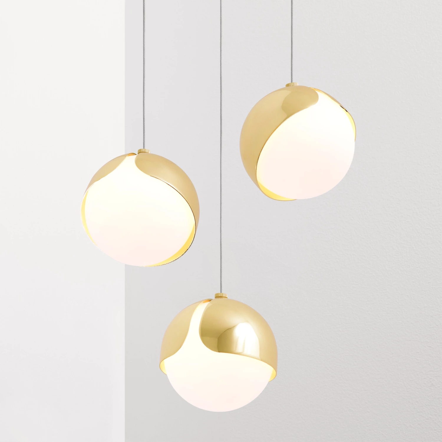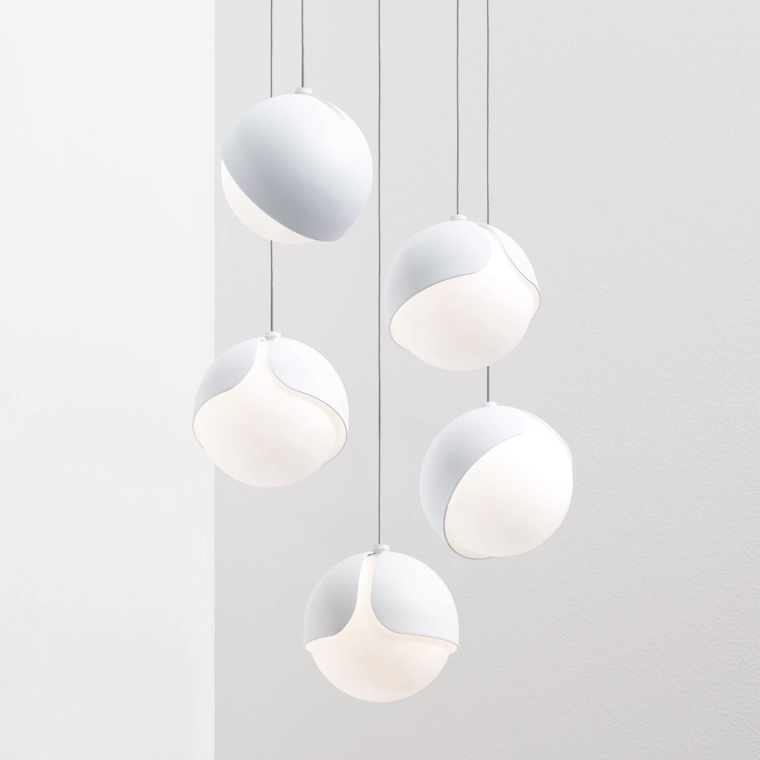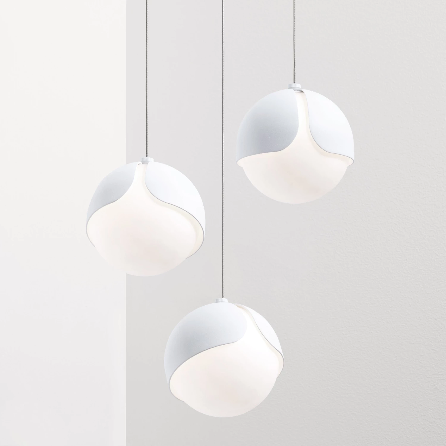 Ohm takes an innovative approach to the conventional sphere. Its orbiting shade allows a customizable variety of lighting directions which invites curiosity and interaction. Suspended in space by a slim cord, each opal glass orb casts a warm ambient glow. The Ohm’s modular quality makes its application versatile, and it works beautifully displayed as a singular pendant or as a clustered arrangement.