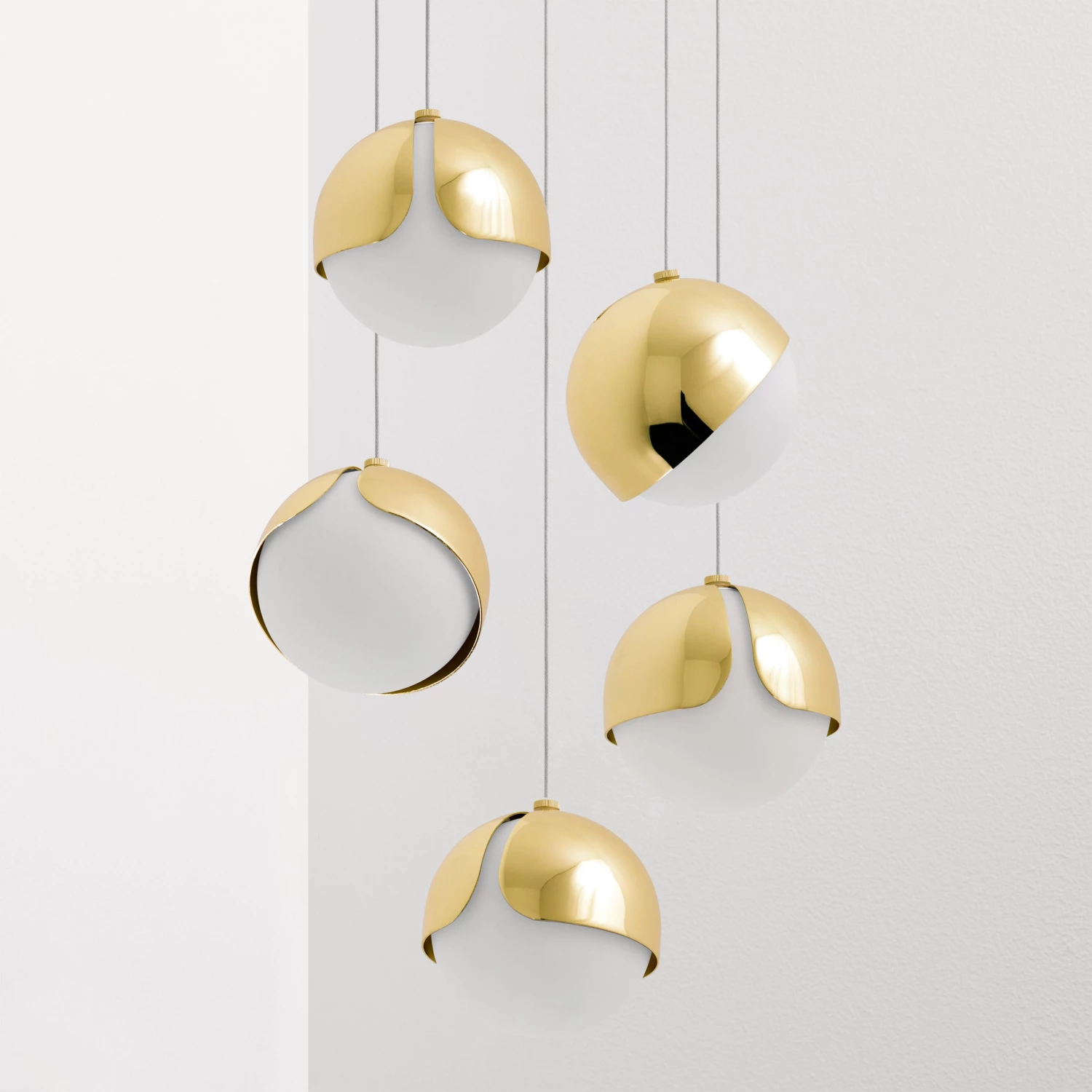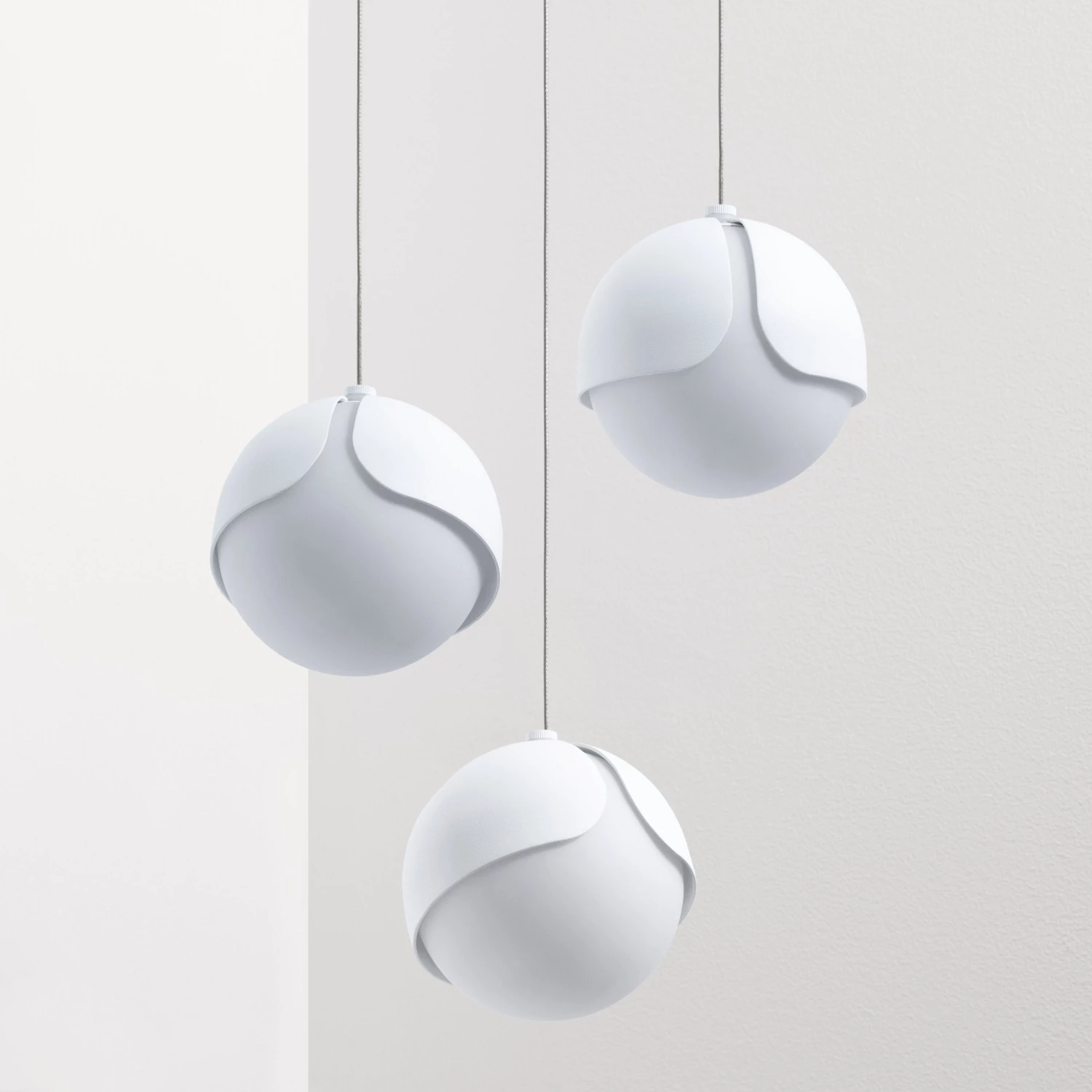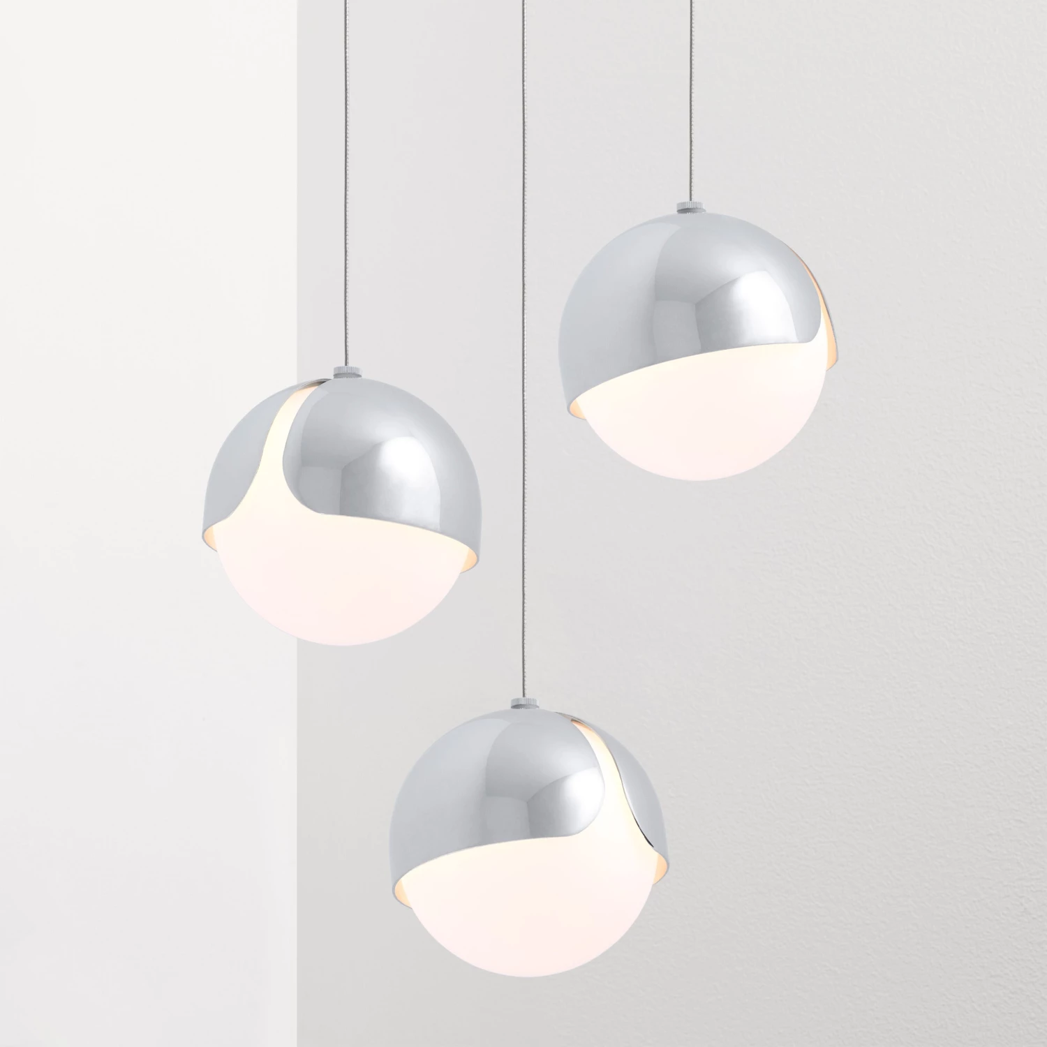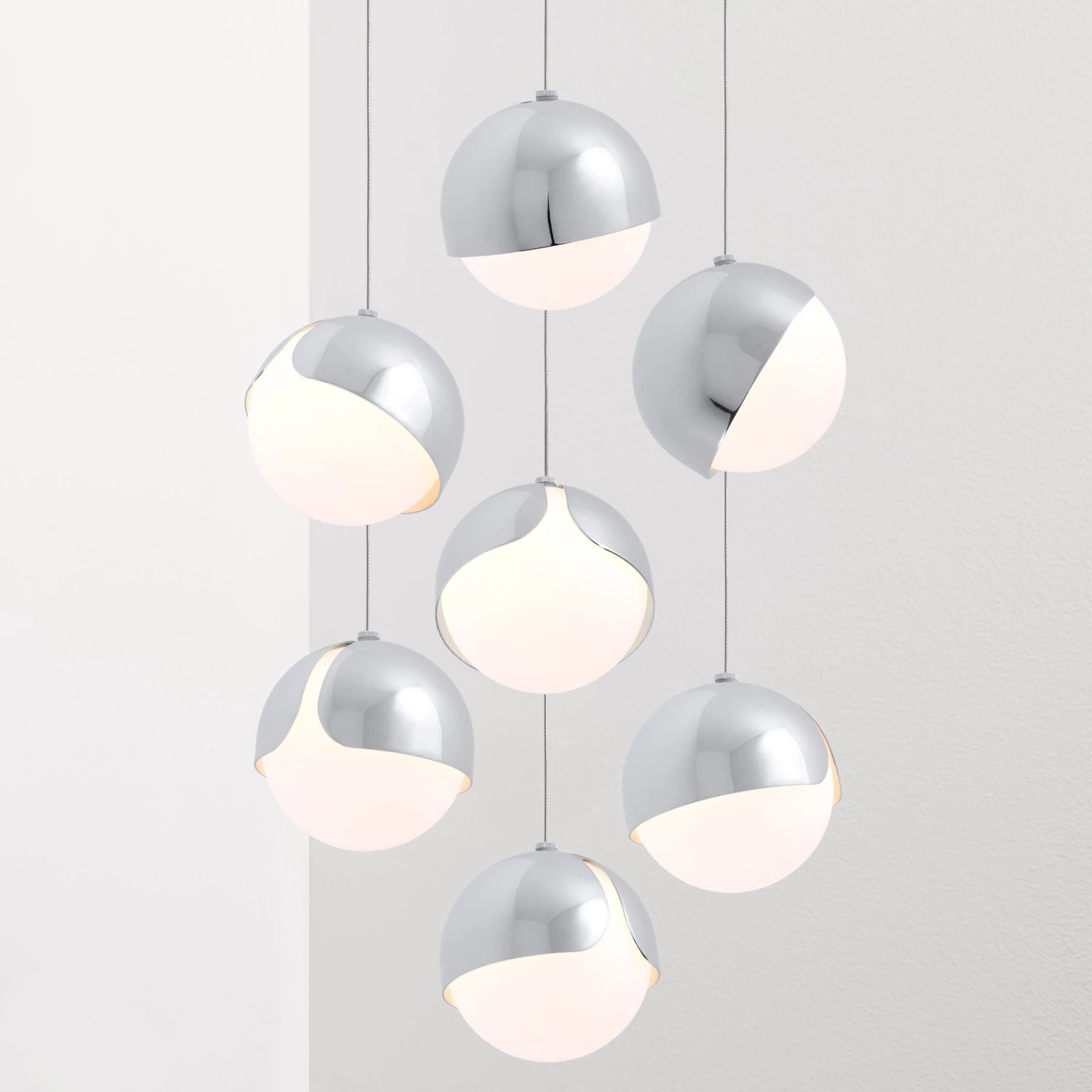 Ohm takes an innovative approach to the conventional sphere. Its orbiting shade allows a customizable variety of lighting directions which invites curiosity and interaction. Suspended in space by a slim cord, each opal glass orb casts a warm ambient glow. The Ohm’s modular quality makes its application versatile, and it works beautifully displayed as a singular pendant or as a clustered arrangement.