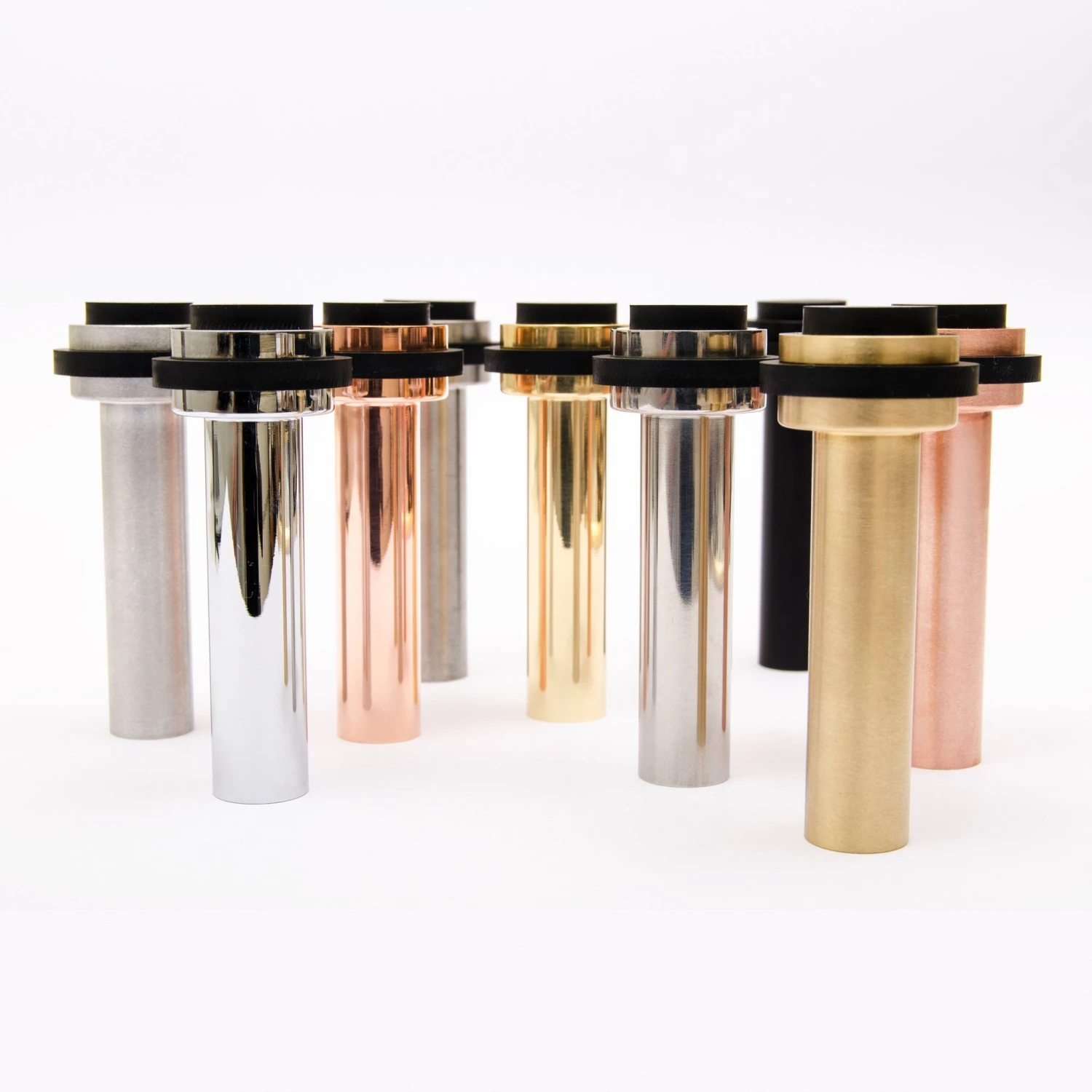 Solid polished brass, solid brushed brass, solid polished copper, solid brushed copper, high-gloss polished and brushed stainless steel, or solid matte black aluminum.