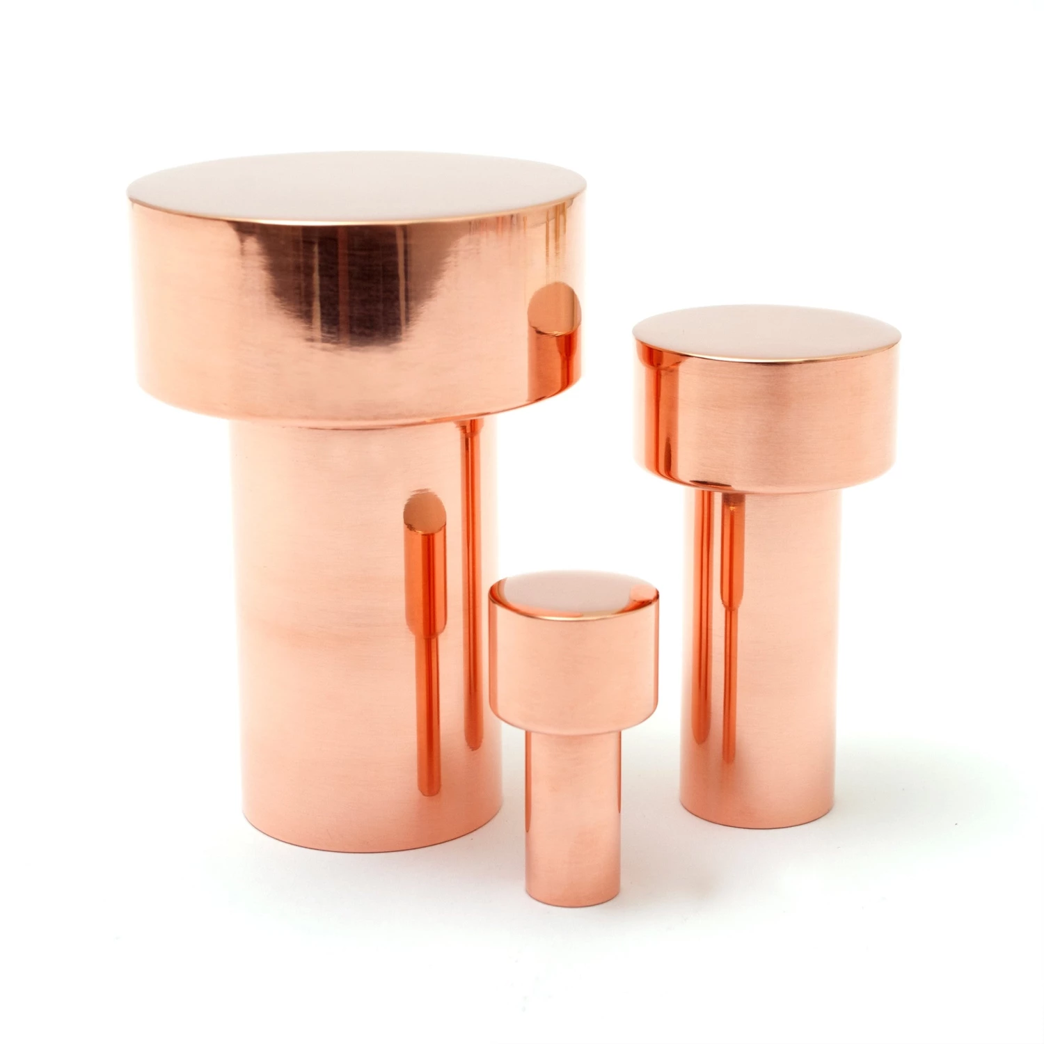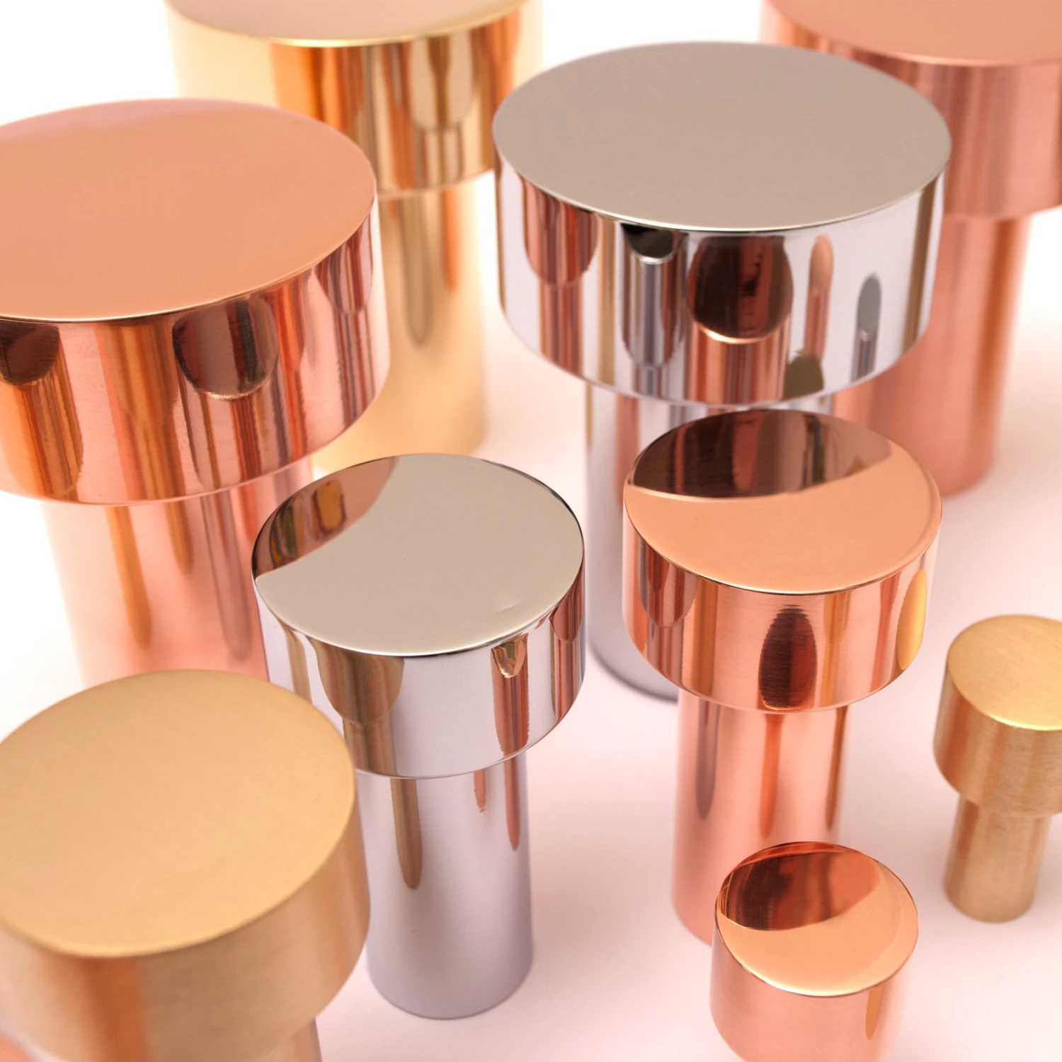 Solid polished brass, solid brushed brass, solid polished copper, solid brushed copper, high-gloss polished and brushed stainless steel, or solid matte black aluminum.