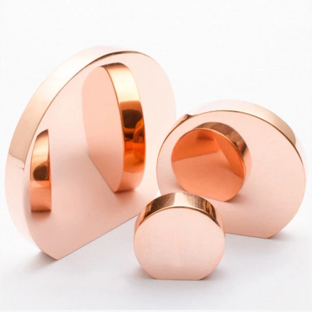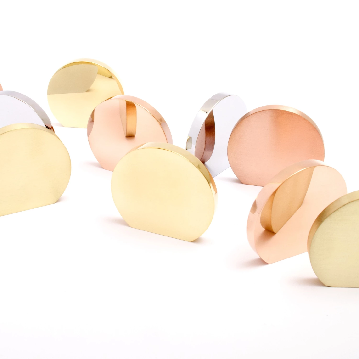 Solid polished brass, solid brushed brass, solid polished copper, solid brushed copper, high-gloss polished and brushed stainless steel, or matte black aluminum.