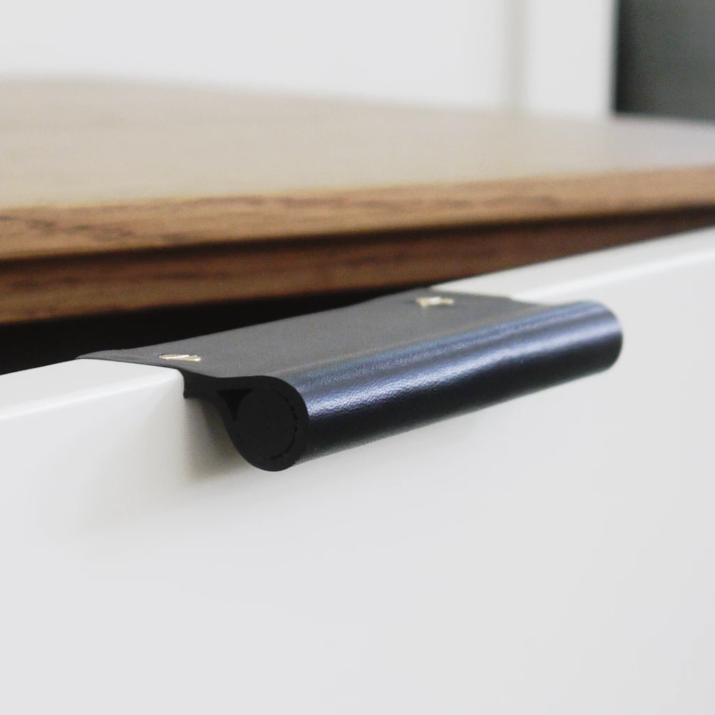 Born out of a passion for simple, modern design and natural materials, the EP02 Leather edge pulls with a matching painted wood core are available in black, taupe, or whiskey brown leather. The handles age, developing character and patina over time. The rich, natural materials of leather and brass are the heart of the collection.