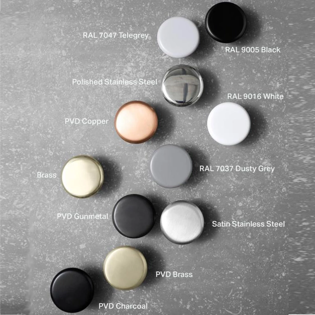 - Powder coated RAL 9005 Black, RAL 9016 White, RAL 7047 Telegrey or RAL 7037 Dusty Grey on Stainless Steel
