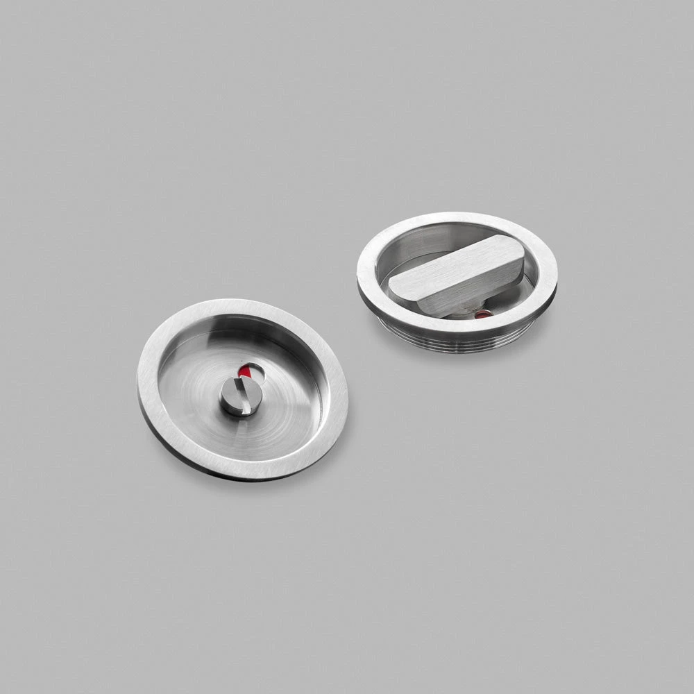 A simple privacy latch that has the option to come with or without a toilet indicator in the coordinated line of minimalist architectural hardware.
