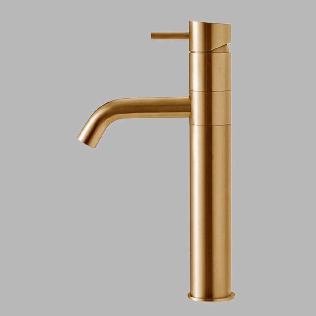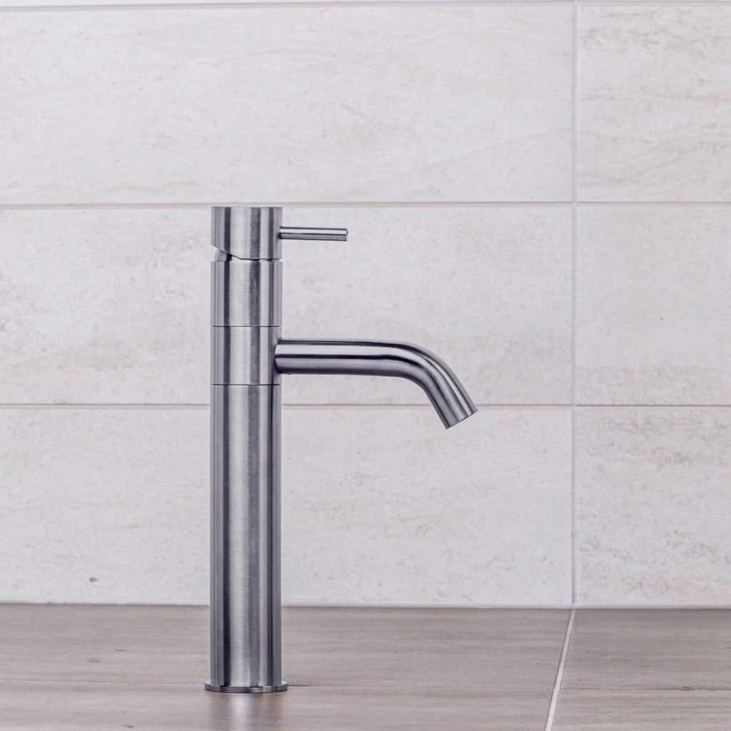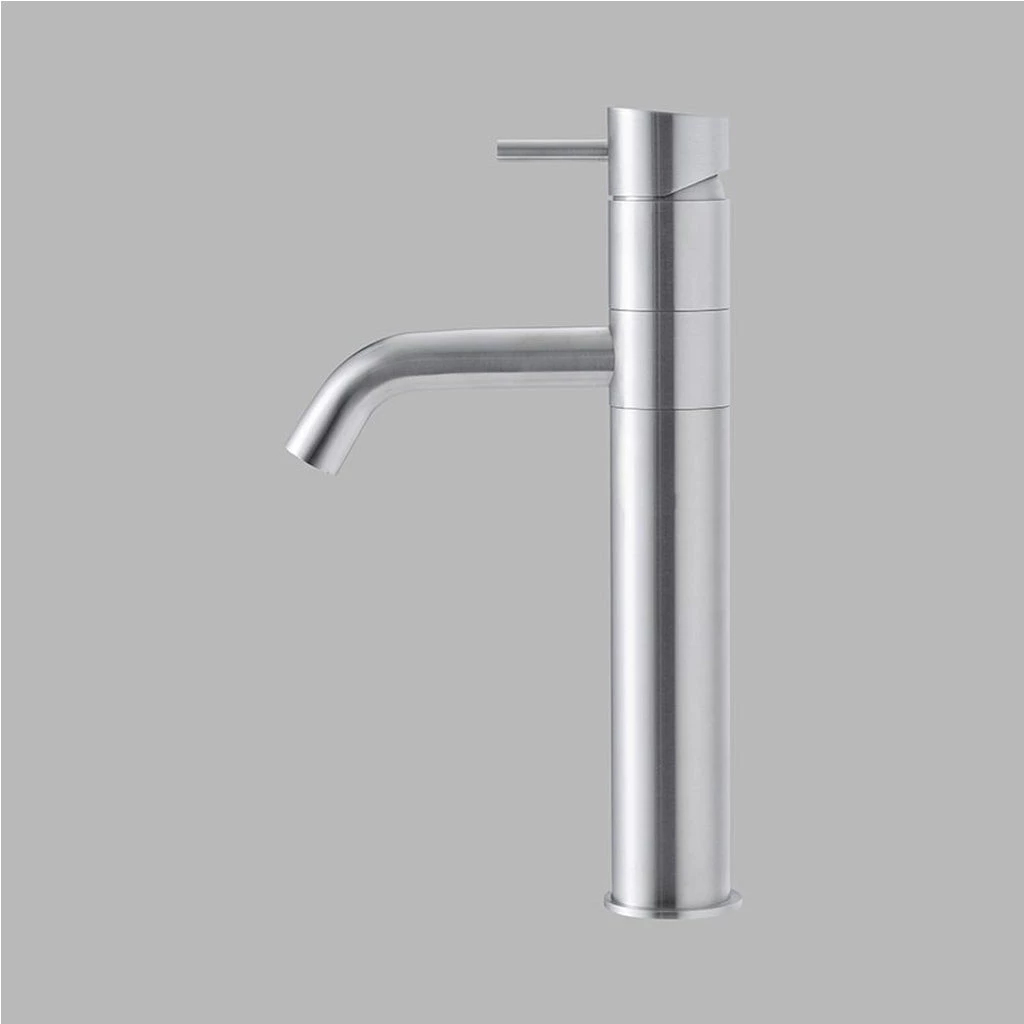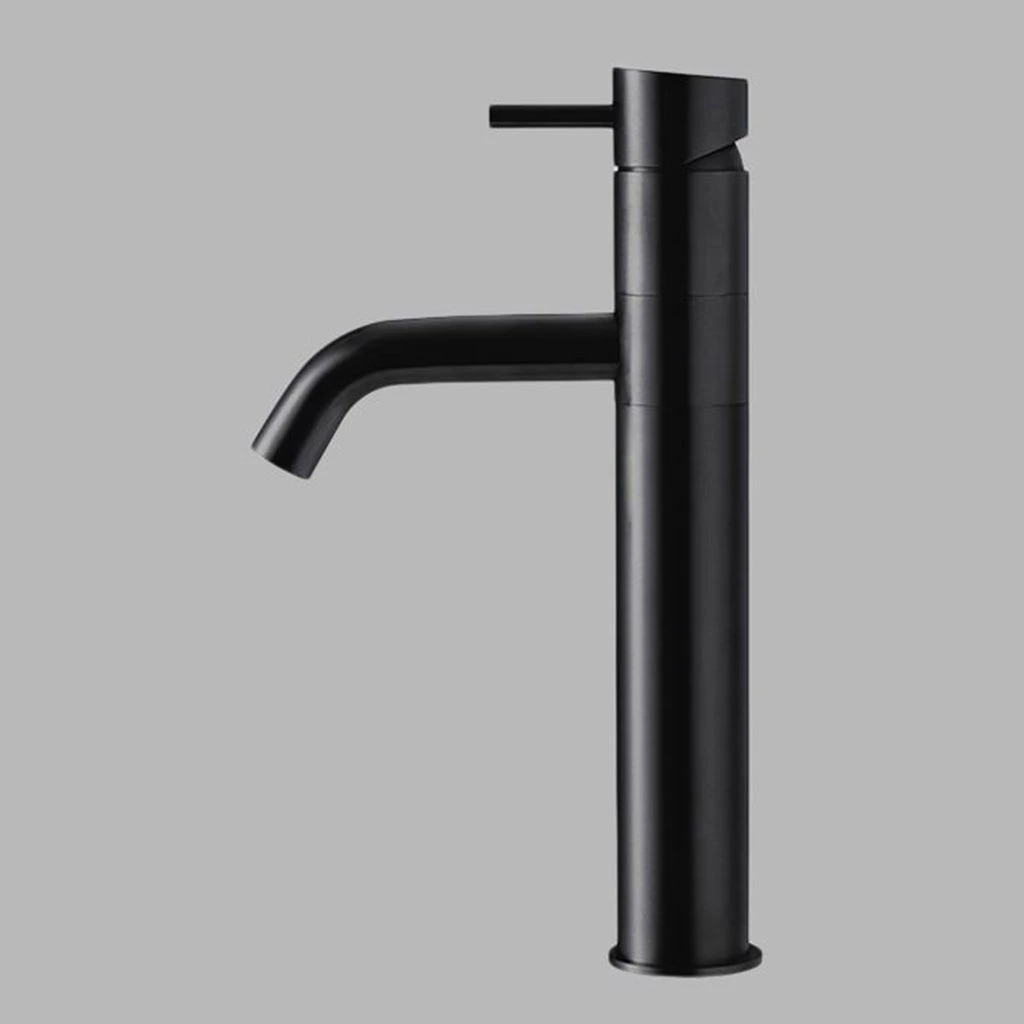 The tap and faucet spout is integrated into one complete piece. Single-hole models come in standard and taller dimensions for bathrooms, with the kitchen version featuring a horizontal extension to the spout.