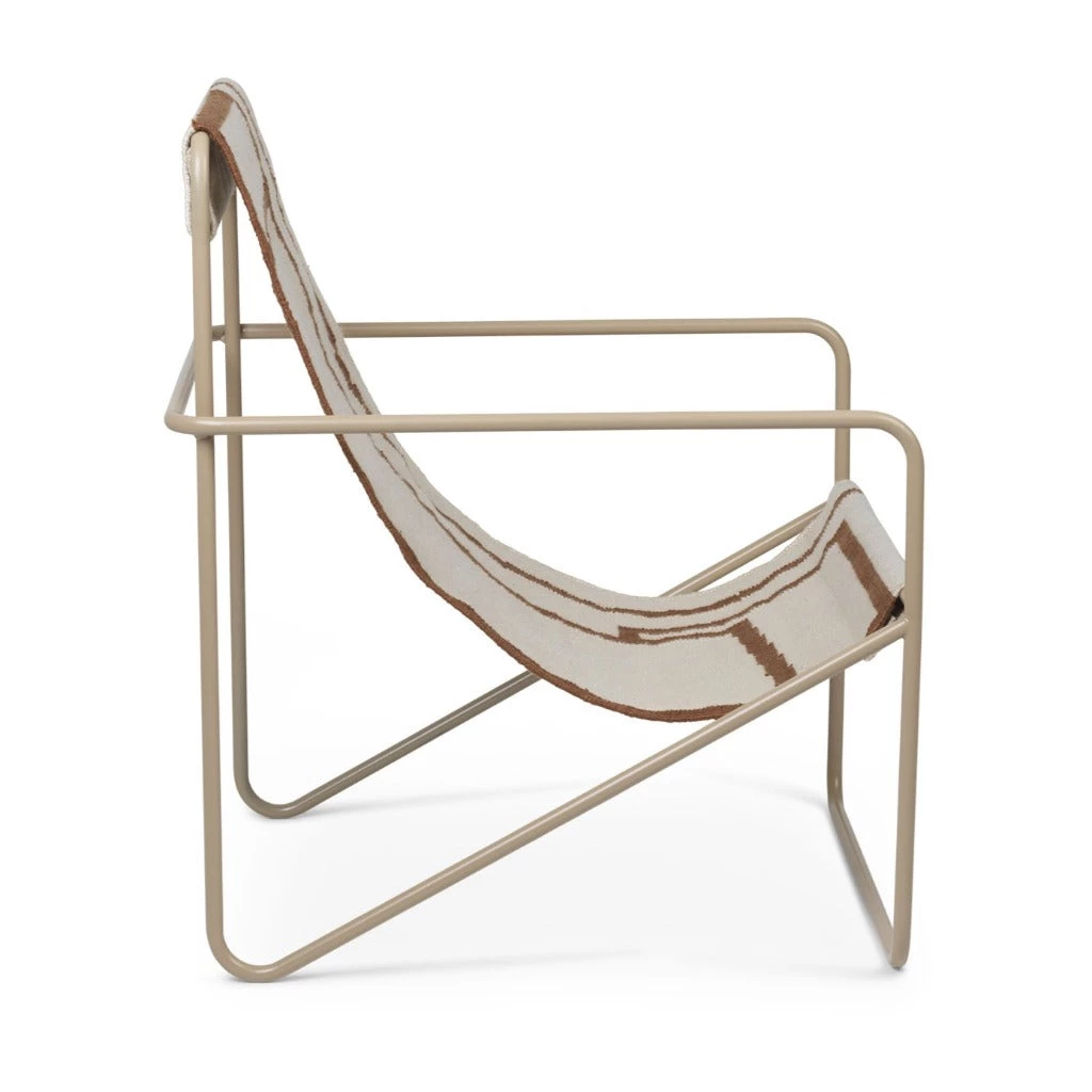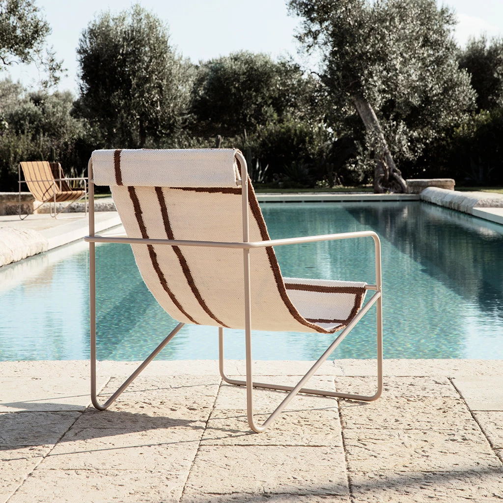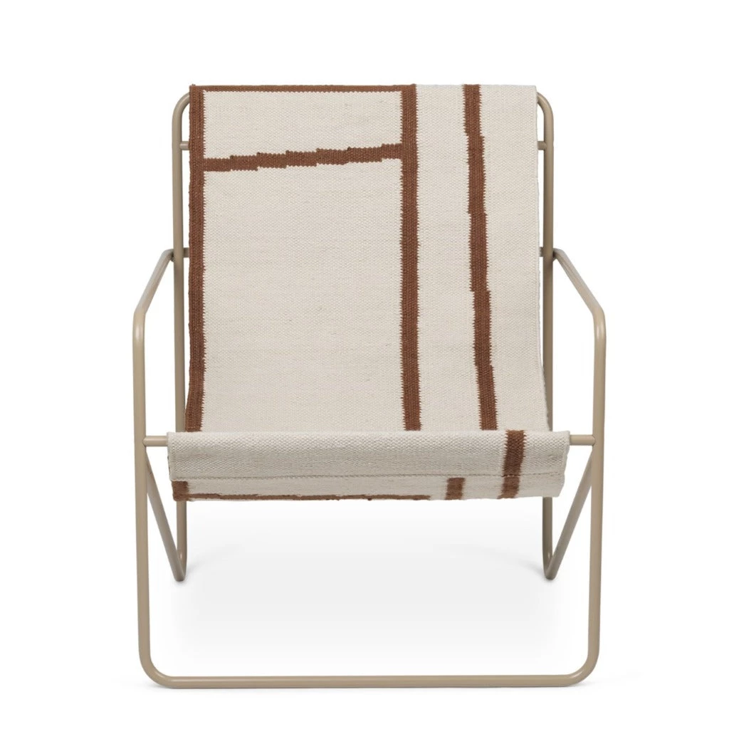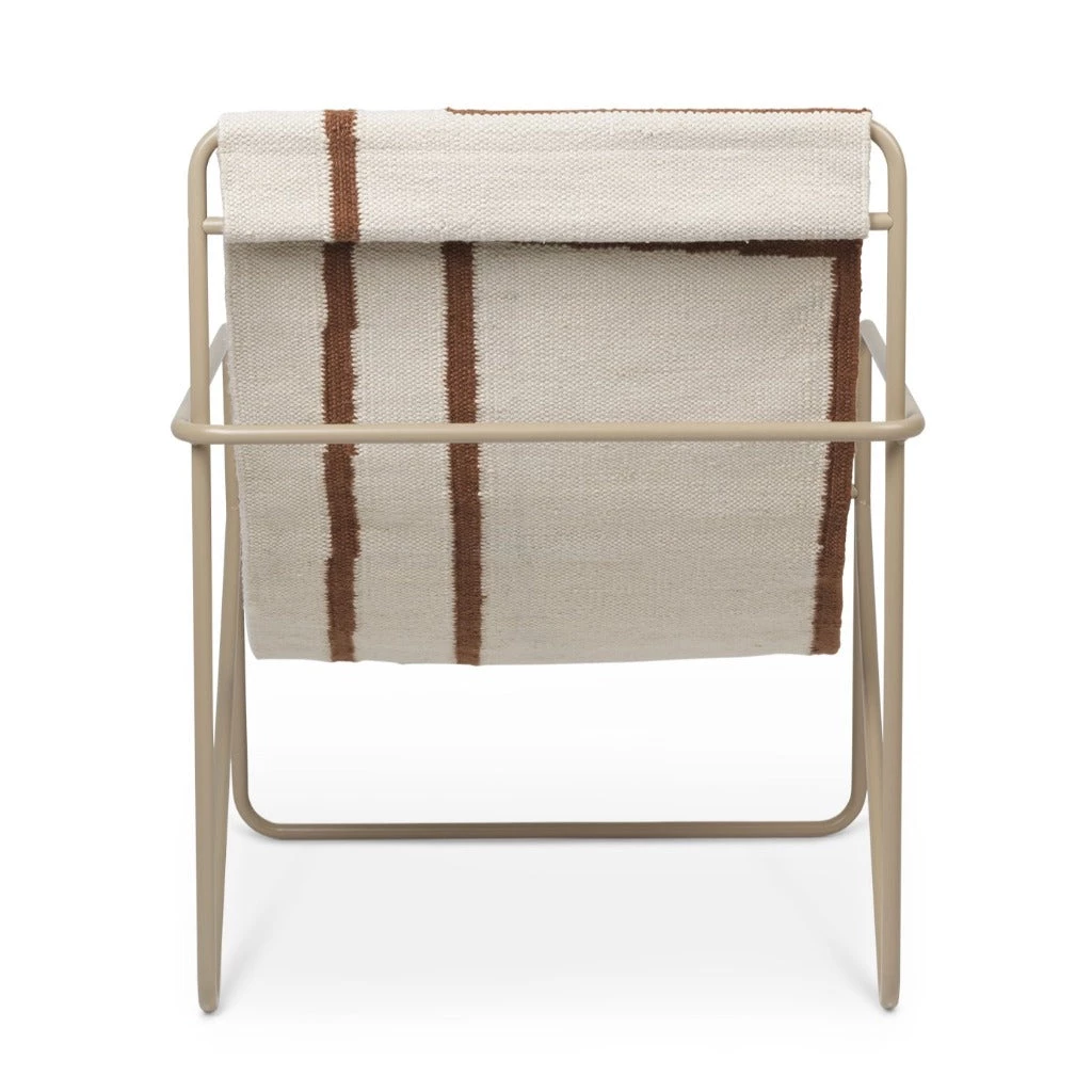 A Modernist chair with a graceful profile, Desert Chair is crafted from a tubular powder-coated steel frame in colours Black or Cashmere, holding an interchangeable woven textile seat made from recycled plastic bottles, available in four designs: Soil, Stripes, Shapes or Solid Cashmere. Suitable for use both indoors and out, the lounge design invites relaxation. Just sit back and enjoy. Made in Denmark.