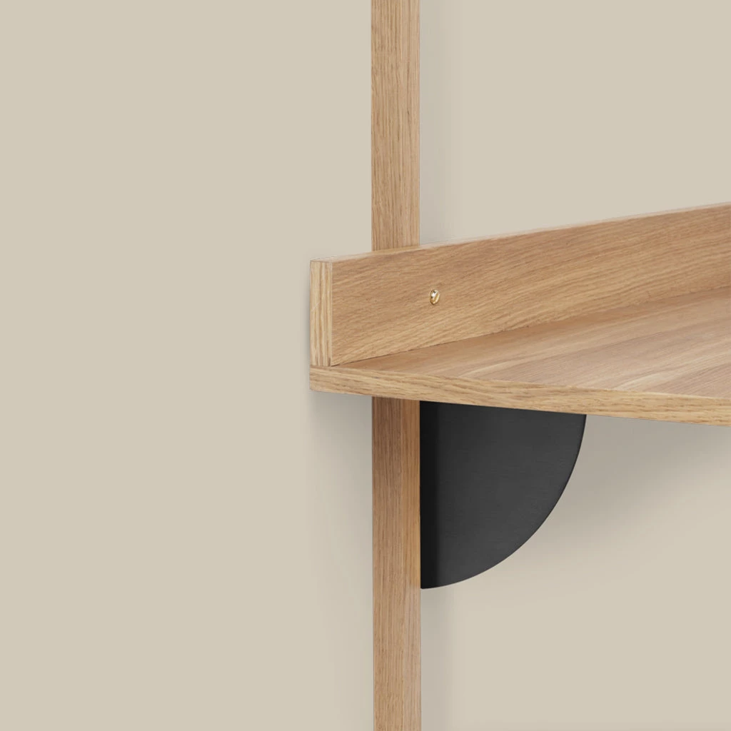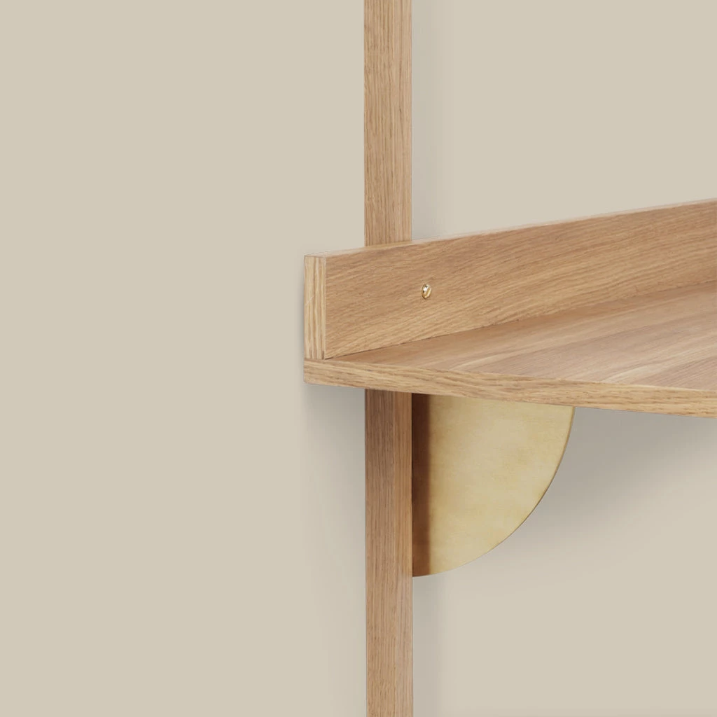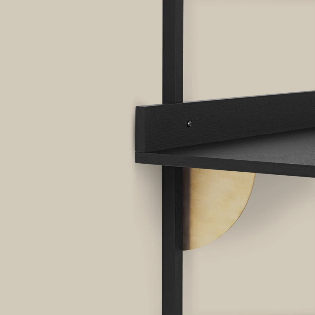 A new and modern take on Mid-century wall mounted desk units, Sector is defined by its sturdy simplicity and classic combination of wood and brass. Use the Sector Desk as a standalone surface or combine it with the Sector Shelves of your choice to form one integrated and cohesive workspace. A short border at the end of the desk forms a small, narrow space that’s ideal for propping up hand-written notes or a favourite photograph. Choose between natural oak veneer or black stained ash veneer with brackets of either polished or blackened brass. Other items in the collection are the Sector Single Shelf and the Sector Triple Shelf.