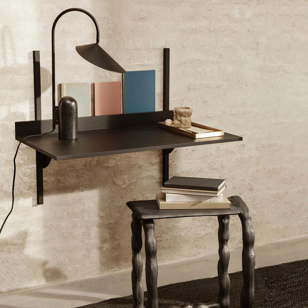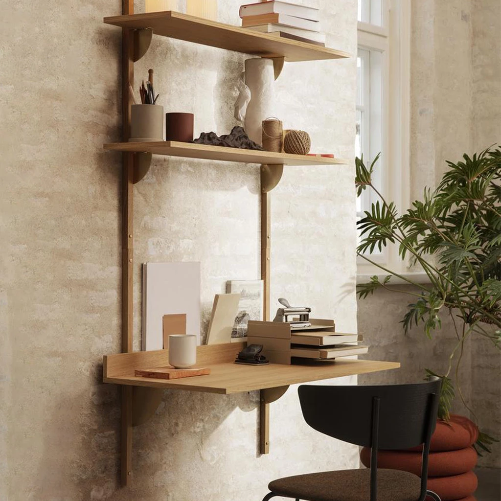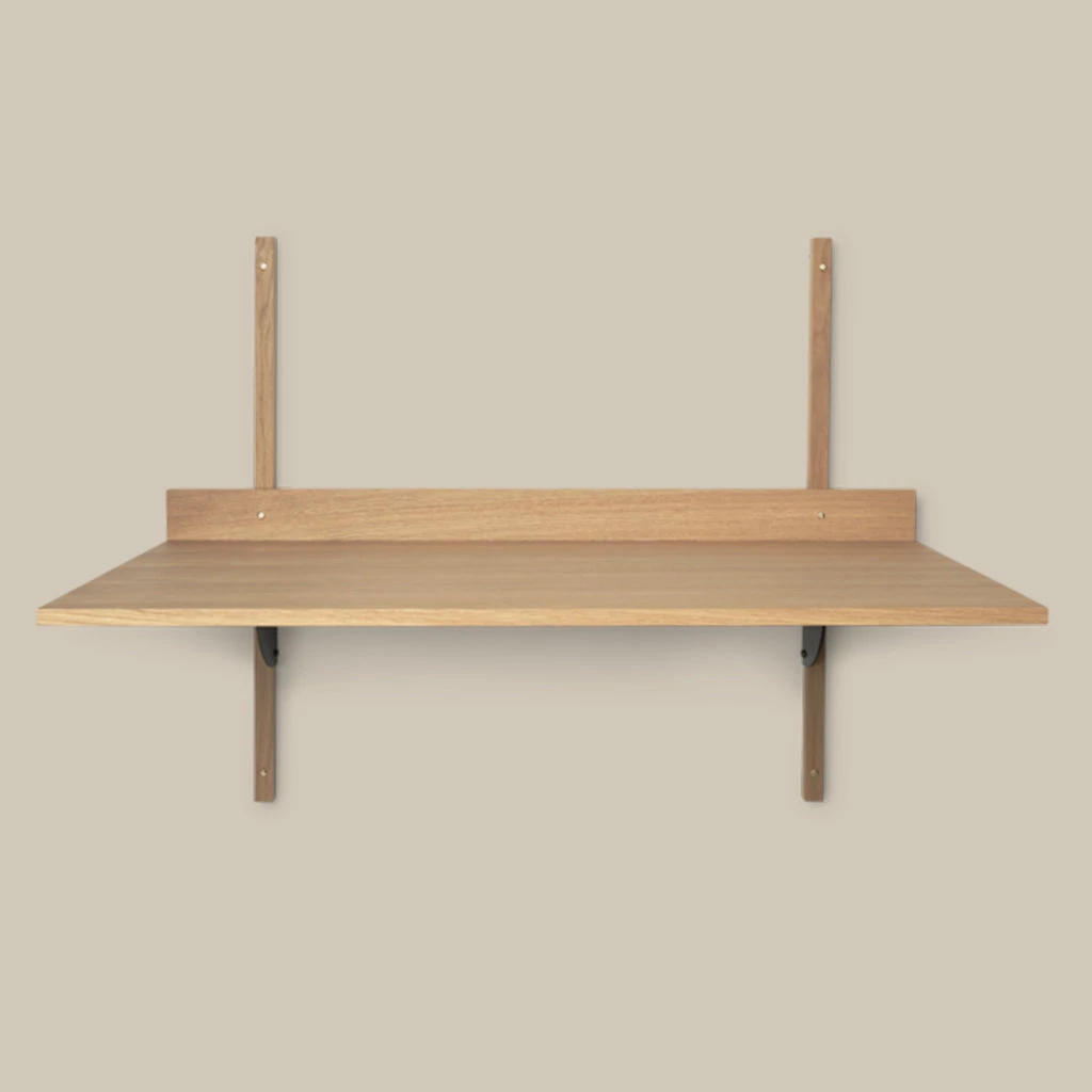 A new and modern take on Mid-century wall mounted desk units, Sector is defined by its sturdy simplicity and classic combination of wood and brass. Use the Sector Desk as a standalone surface or combine it with the Sector Shelves of your choice to form one integrated and cohesive workspace. A short border at the end of the desk forms a small, narrow space that’s ideal for propping up hand-written notes or a favourite photograph. Choose between natural oak veneer or black stained ash veneer with brackets of either polished or blackened brass. Other items in the collection are the Sector Single Shelf and the Sector Triple Shelf.