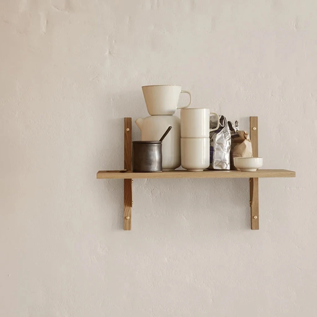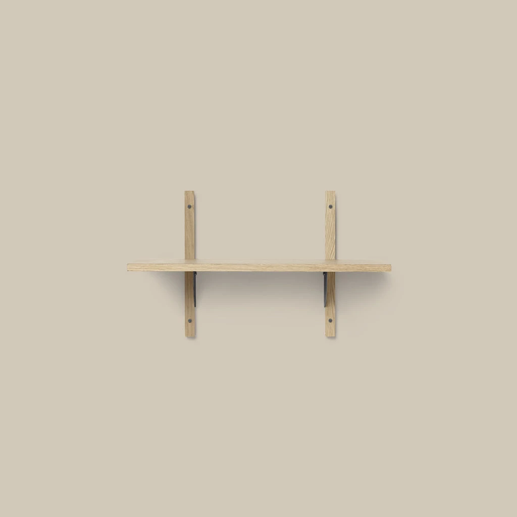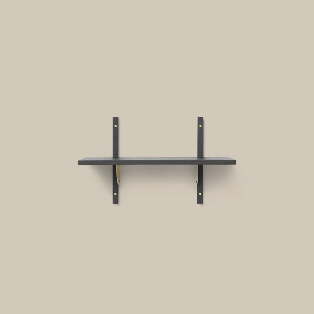 A new and modern take on Mid-century shelving units, Sector is defined by its sturdy simplicity and classic combination of wood and brass – available with natural oak veneer or black stained ash veneer shelves, and polished brass or blackened brass brackets. Available in two sizes, the shelf attaches to a wall with the accompanying solid wood uprights with visible screws. Use it to display favourite objects in a living room or storage jars in a kitchen. Other items in the collection are the Sector Triple Shelf and the Sector Desk.