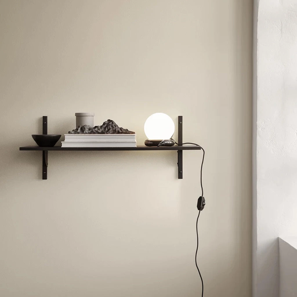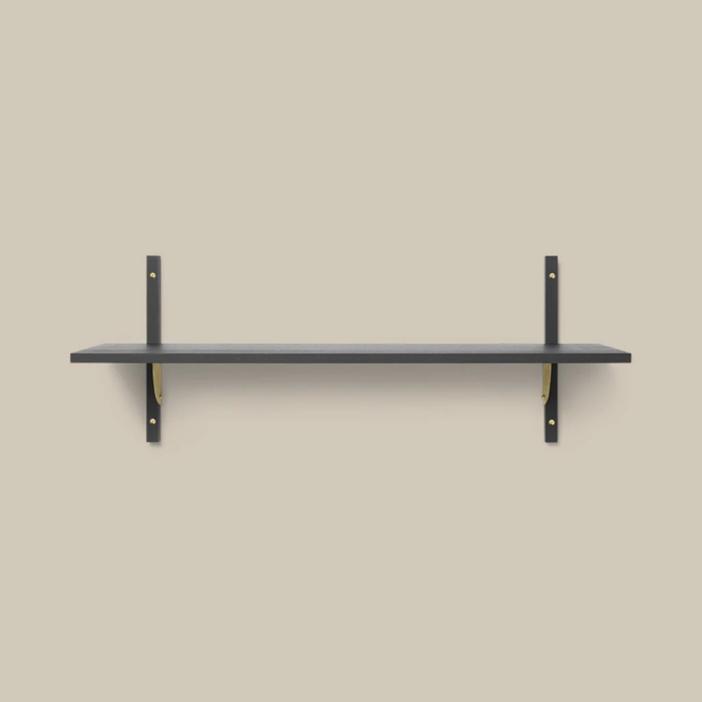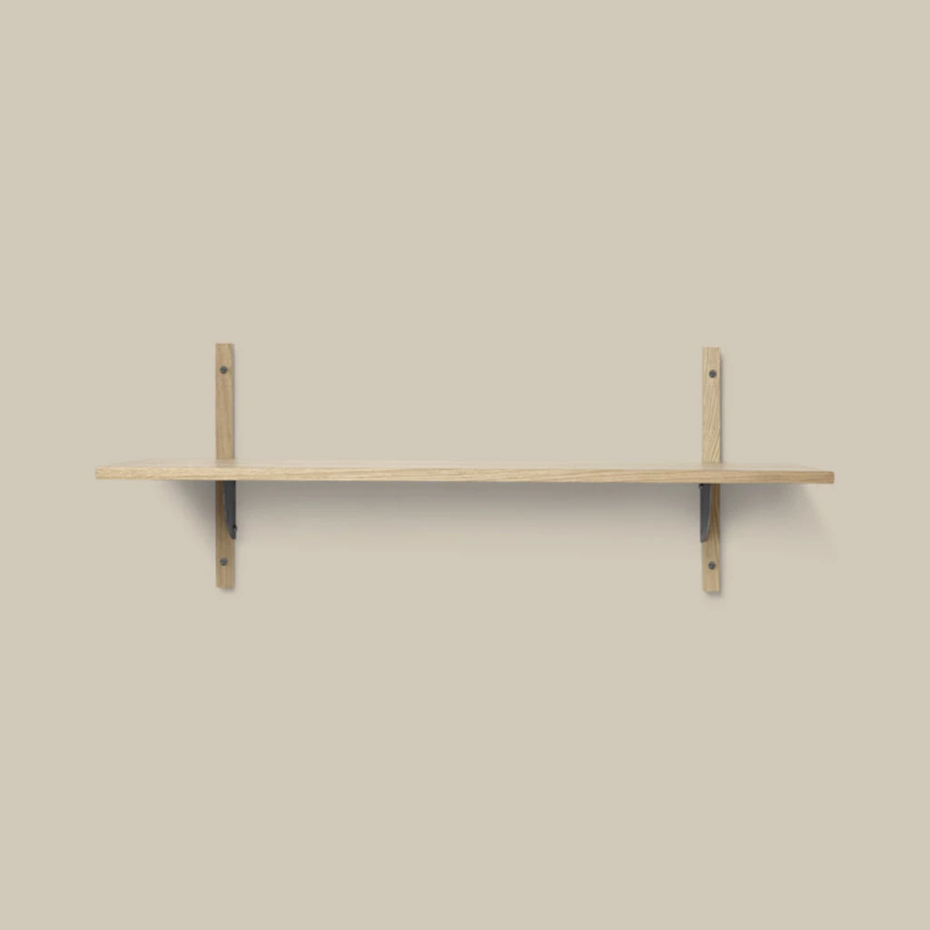 A new and modern take on Mid-century shelving units, Sector is defined by its sturdy simplicity and classic combination of wood and brass – available with natural oak veneer or black stained ash veneer shelves, and polished brass or blackened brass brackets. Available in two sizes, the shelf attaches to a wall with the accompanying solid wood uprights with visible screws. Use it to display favourite objects in a living room or storage jars in a kitchen. Other items in the collection are the Sector Triple Shelf and the Sector Desk.
