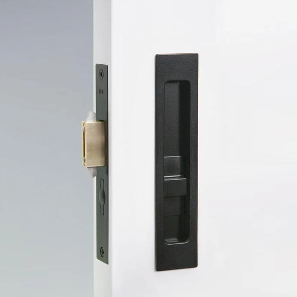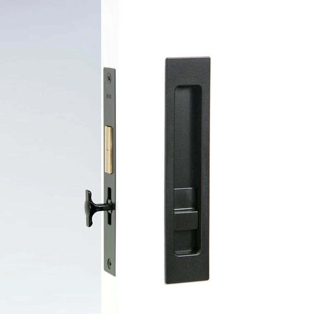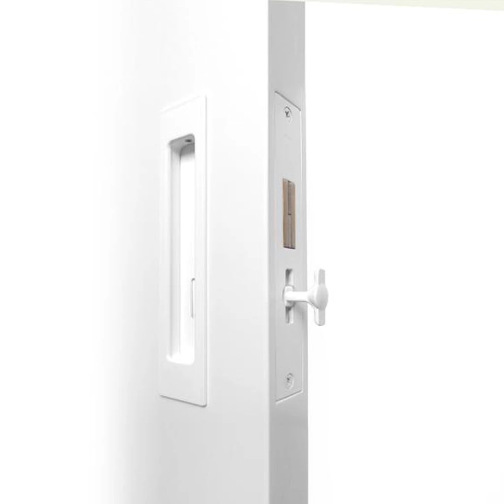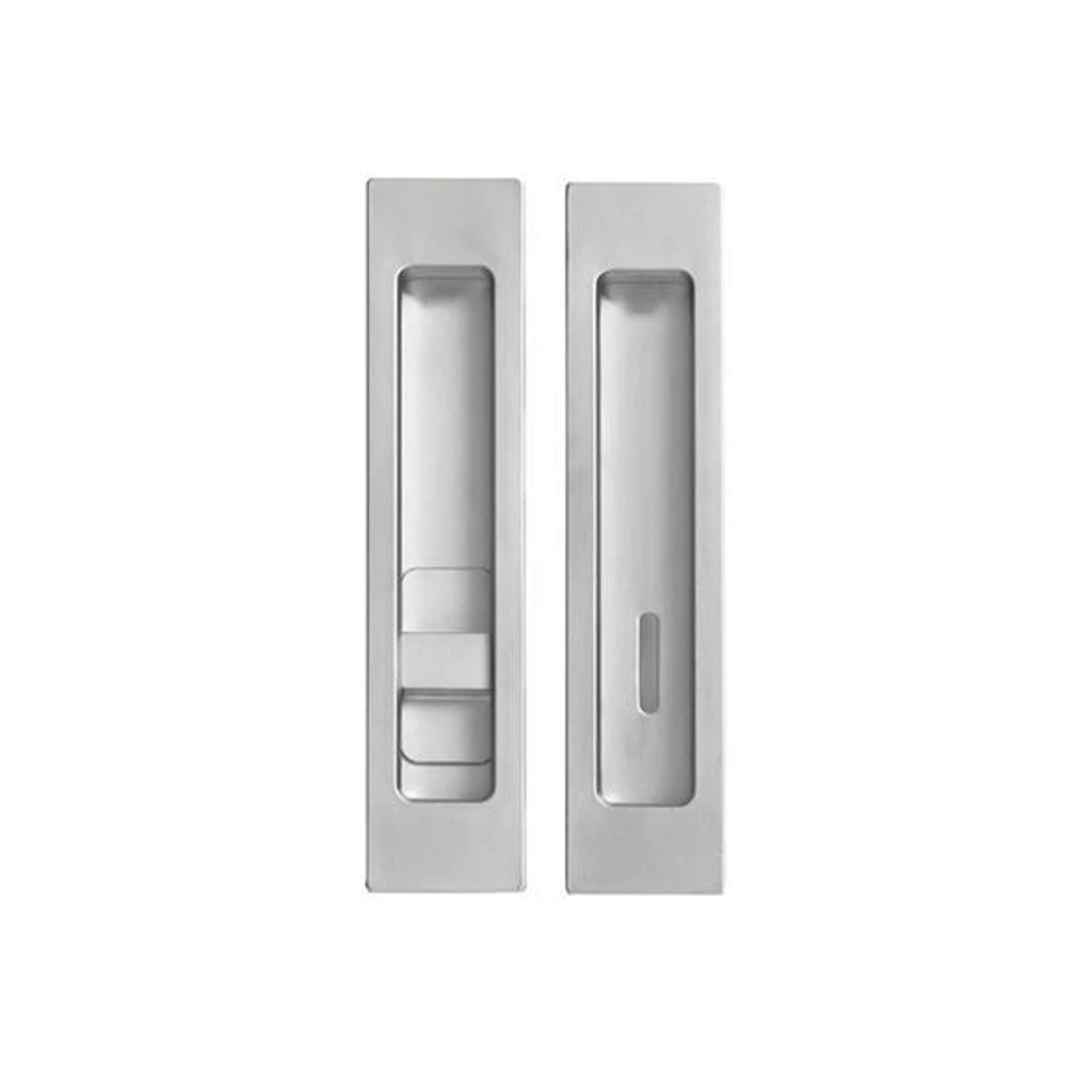 The HB690 privacy sliding door lock includes a snib flush pull inside and emergency release flush pull outside for safe, efficient, locking on bathroom and washroom pocket door sliders.