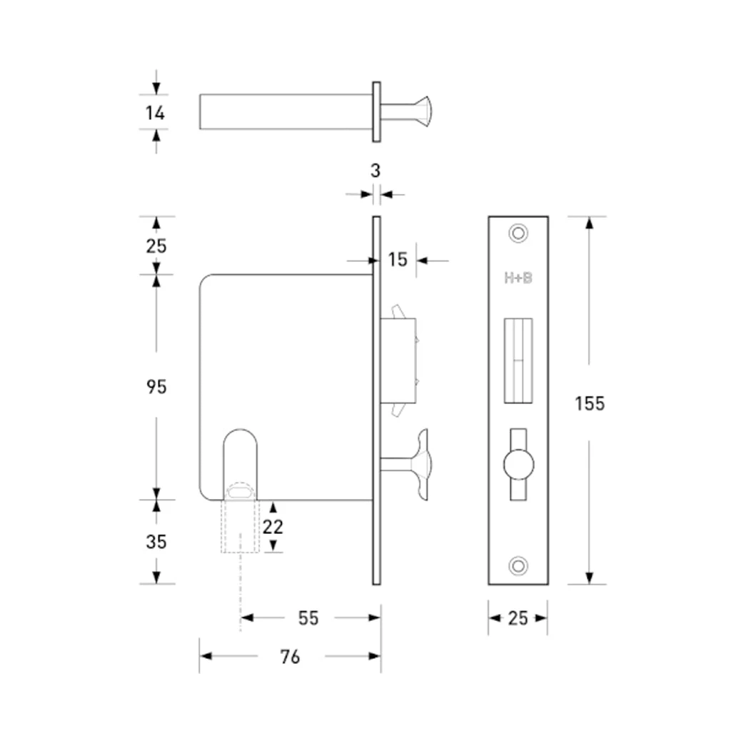 The Halliday+Baillie HB 690 sliding door privacy set features an integrated push button-activated edge pull for pocketed doors. The operable snib slides upwards to engage the lock. The discrete emergency release can be operated with a pen or other small pointed object to disengage the lock from the outside. For narrower doors (35-38mm) flush pulls either side are shallower than the standard HB 690 flush pulls