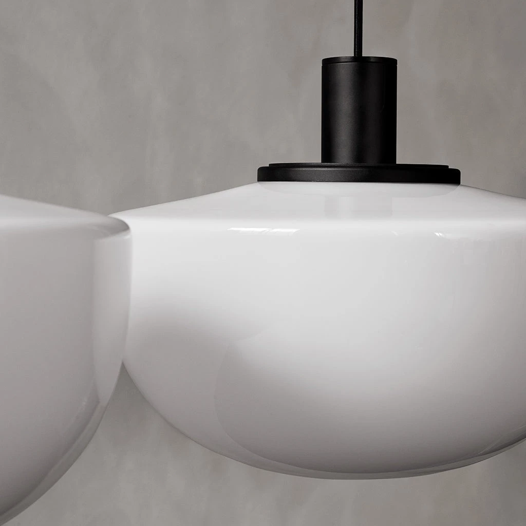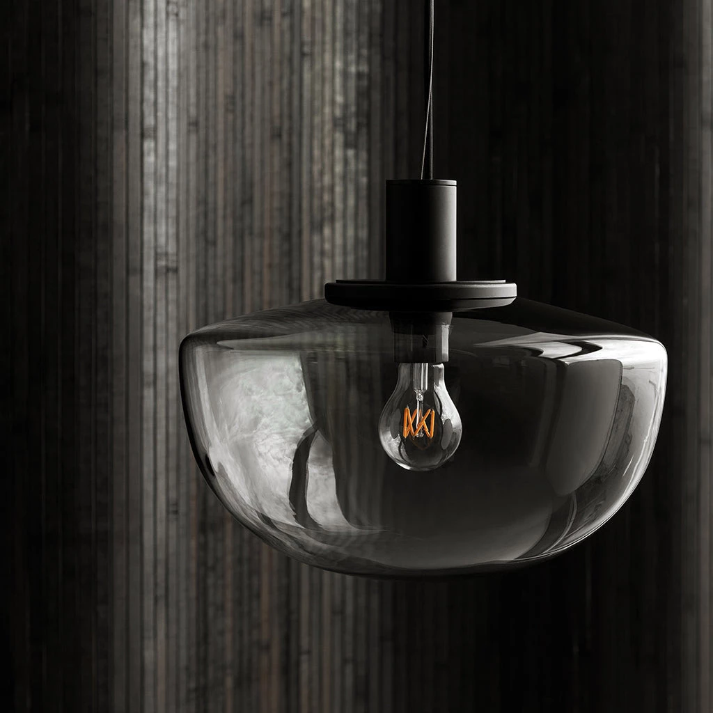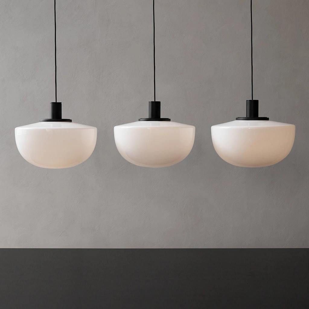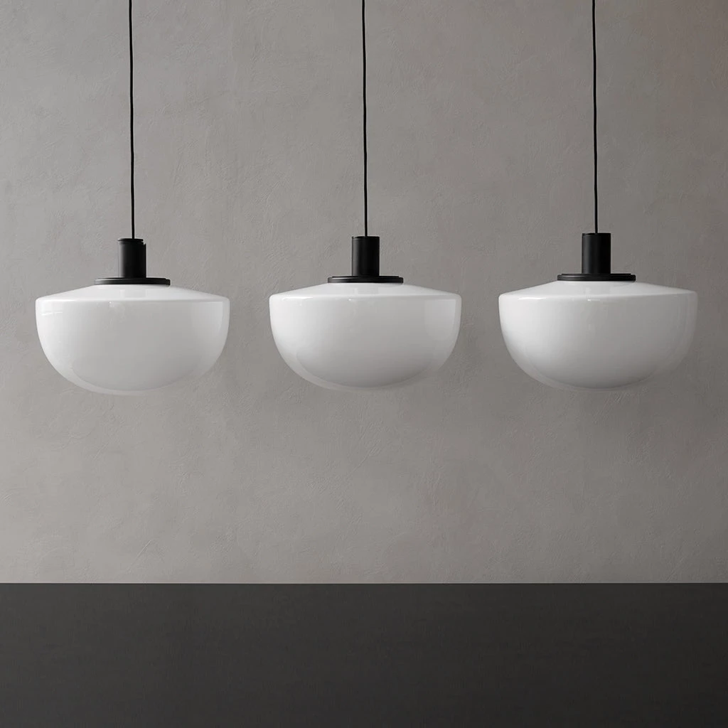 The Bank Pendant is an indoor, semicircular pendant crafted from opal or smoke mouth-blown glass and black powder-coated aluminum fittings. The opaque glass gently diffuses 360-degree light from any E26 bulb, creating ambiance and providing excellent task lighting. The pairing of opaque glass and fine metal lends the product enduring quality, tactility and longevity. A special fitting with a wire ensures that the unique glass shade can easily be adjusted to hang evenly.