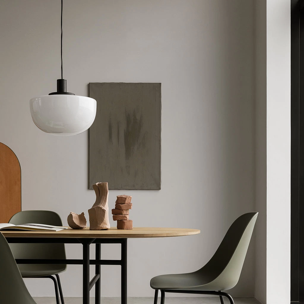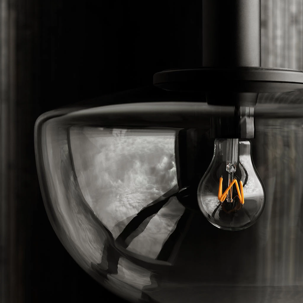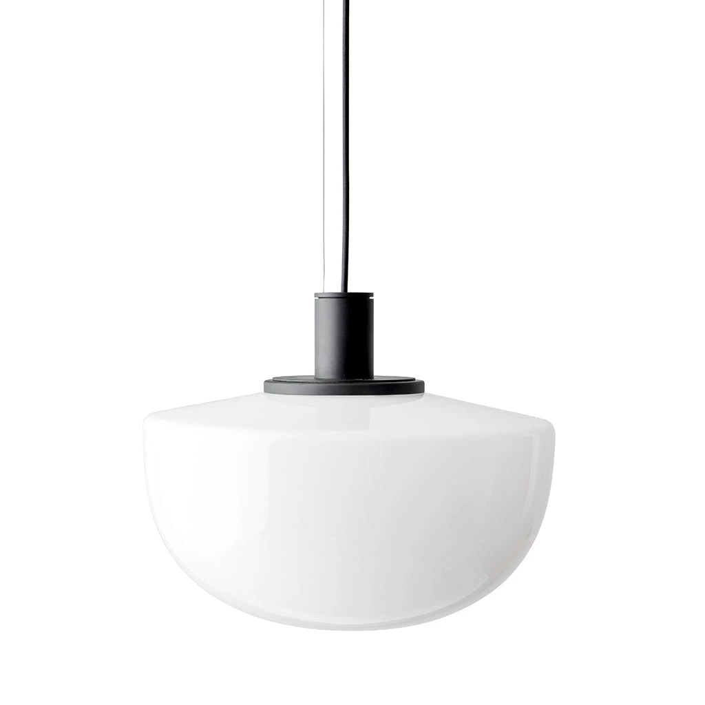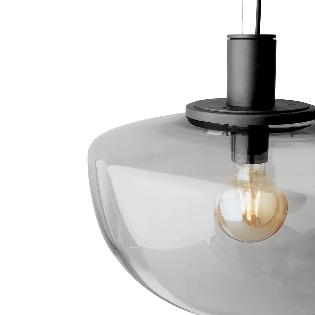The Bank Pendant is an indoor, semicircular pendant crafted from opal or smoke mouth-blown glass and black powder-coated aluminum fittings. The opaque glass gently diffuses 360-degree light from any E26 bulb, creating ambiance and providing excellent task lighting. The pairing of opaque glass and fine metal lends the product enduring quality, tactility and longevity. A special fitting with a wire ensures that the unique glass shade can easily be adjusted to hang evenly.