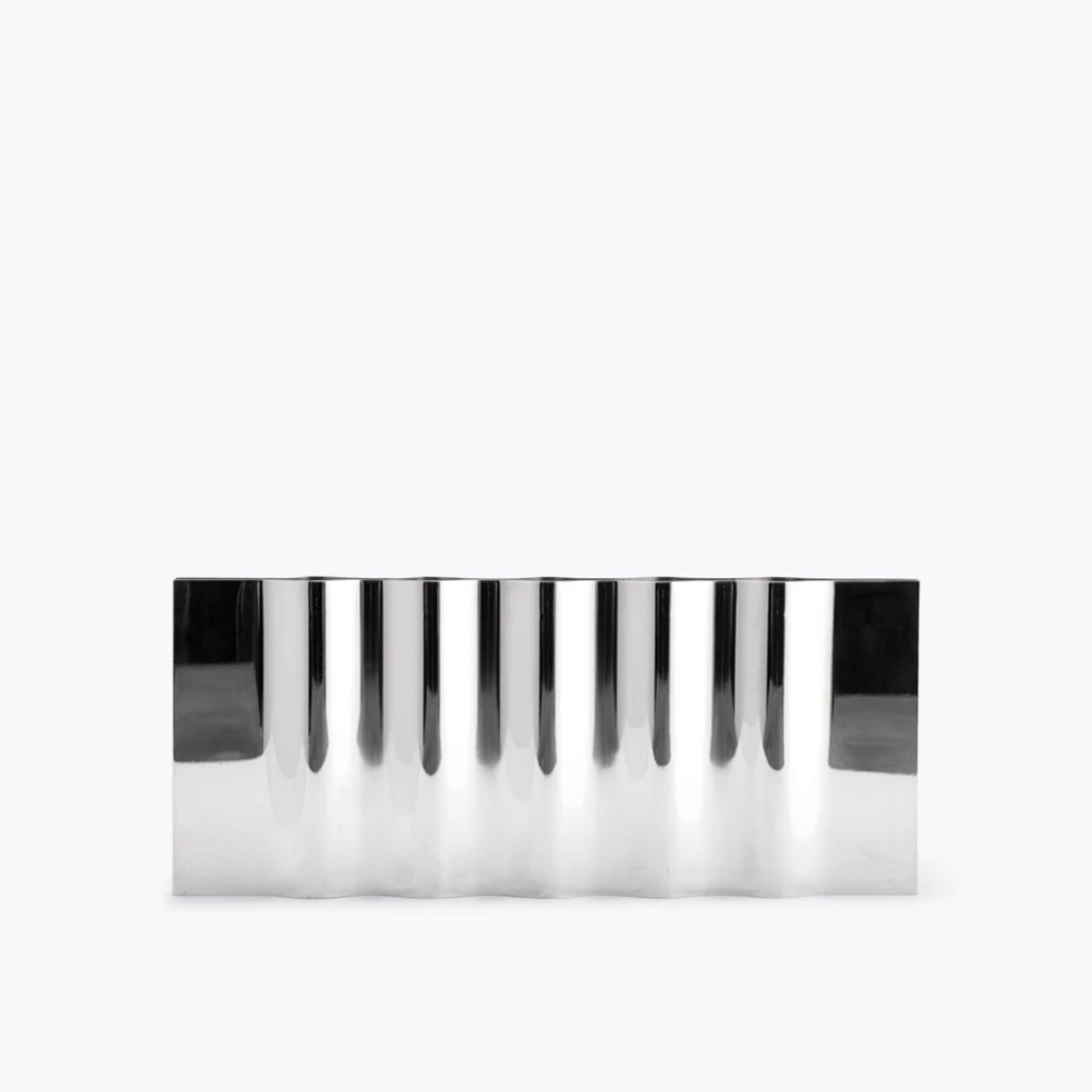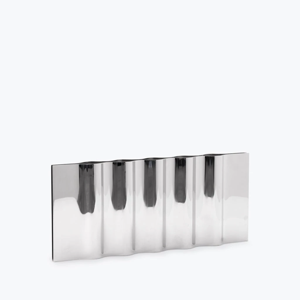 Reminiscent of a ripple across a glassy lake, the Ripply Candle Holder reflect the environment through their curved forms. Made from mirror polished stainless steel, these soft shapes transform an industrial material into something almost ephemeral. Existing as a sculptural form, function is only revealed when placing a candle into one of the widening voids between the sheets of steel.