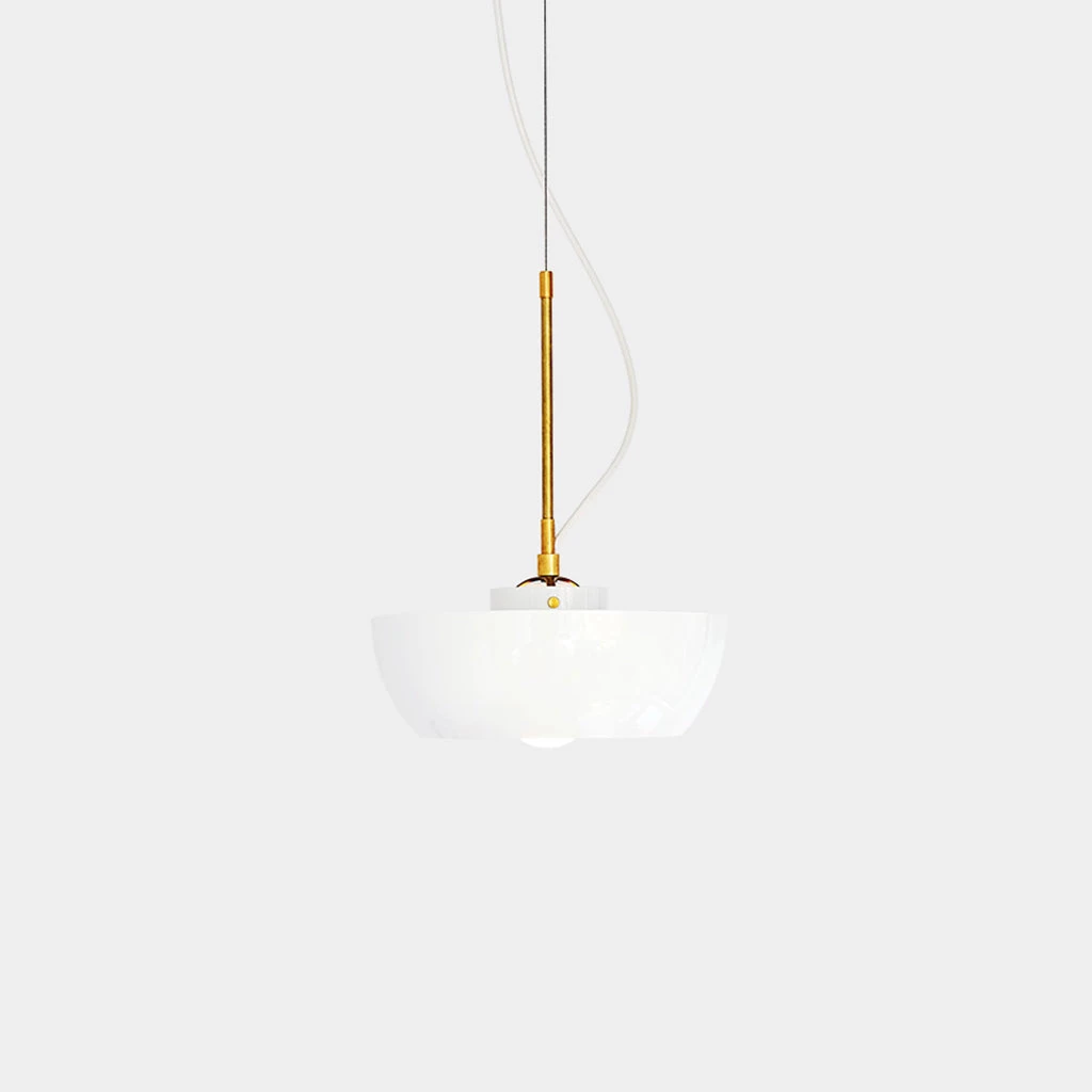 Finishes: aluminum parts are powder-coated gloss white, brass parts are brushed and uncoated, will patina over time.