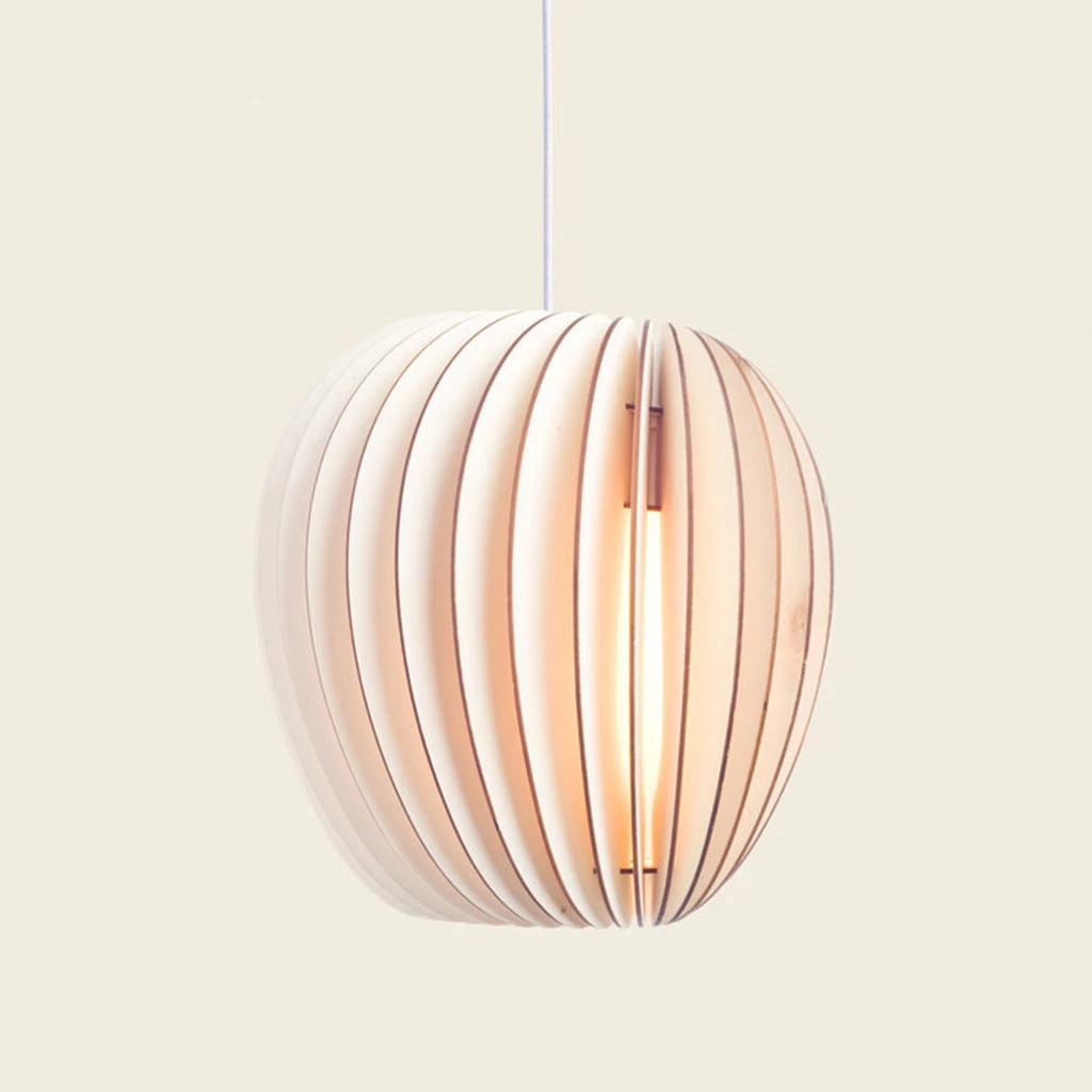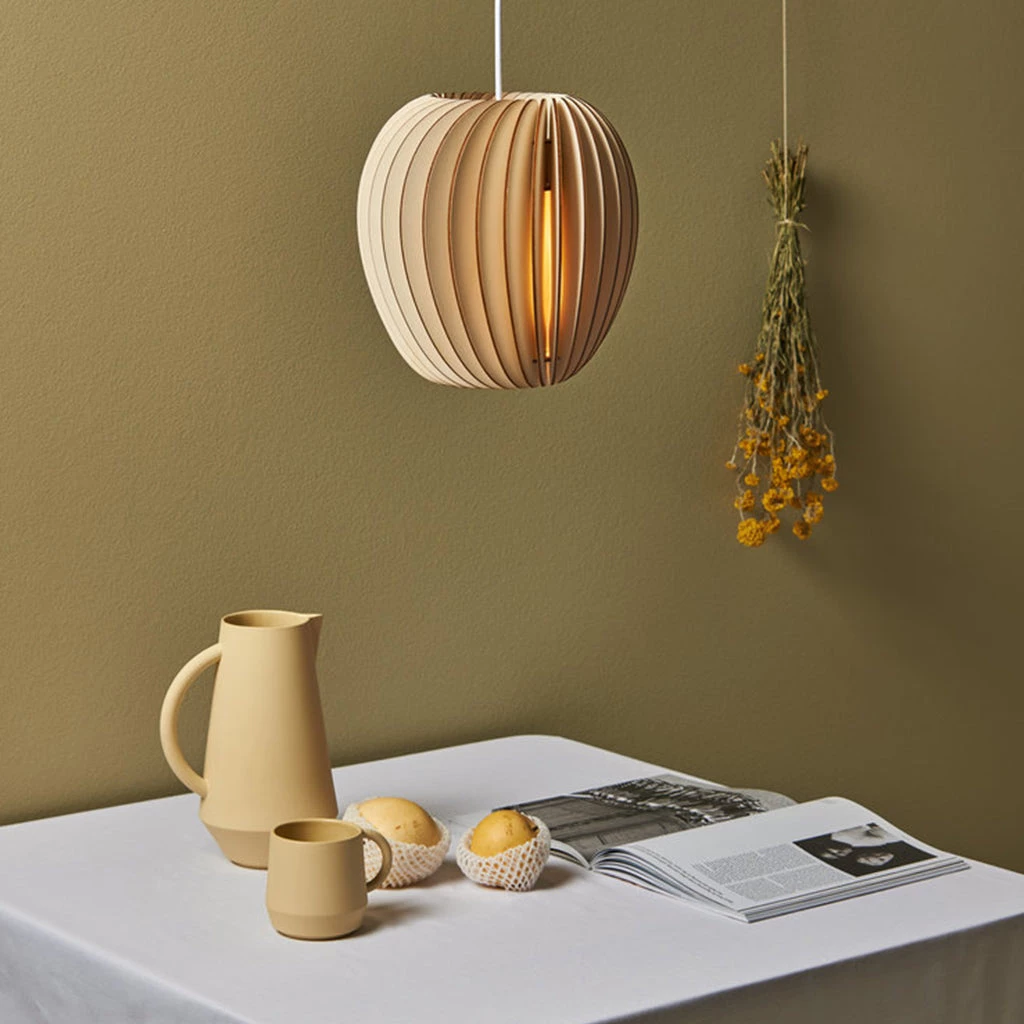 Pirum, Secundum and Volum: Three lamps that emit naturally warm light. All three lights are constructed by the same principles and yet every lamp stands out with its own special shape and character. The intricate structure of the lamp allows the light to subtly shine through the thin wooden slats and cast a glare-free light which creates a natural ambience. The lamp is hand manufactured of untreated, sustainable wood in Lübeck, Germany.
