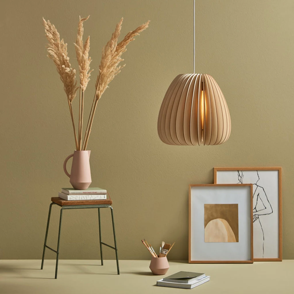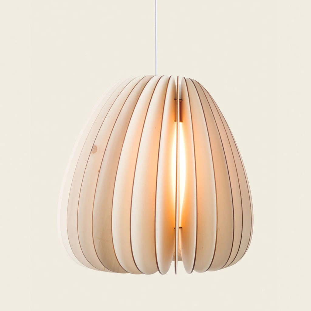 Pirum, Secundum and Volum: Three lamps that emit naturally warm light. All three lights are constructed by the same principles and yet every lamp stands out with its own special shape and character. The intricate structure of the lamp allows the light to subtly shine through the thin wooden slats and cast a glare-free light which creates a natural ambiance. The lamp is hand manufactured of untreated, sustainable wood in Lübeck, Germany.