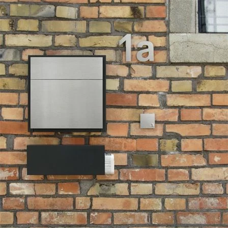 This square and modern doorbell push plate in brushed stainless makes a beautiful and graphic statement to your exterior. The offset button placement adds a nice touch.